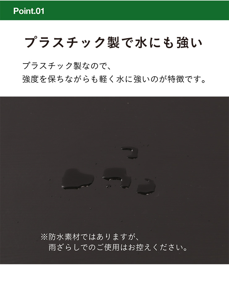 | さまざまなシチュエーションで活躍する収納BOX 収納ボックスベンチ 270L シンプルデザイン ブラックに木目模様が施されたシンプルなデザインで、玄関先などの屋外やお部屋でもシンプルにお使い頂けます。 たっぷり収納 内寸は、幅104×奥行49×53cmあり、容量は270Lとたっぷり収納できます。ポリタンク収納やゴミ箱としてもご使用頂けます。 ベンチにも 蓋上の耐荷重は100kgでベンチや腰掛けとしてもお使い頂け、屋外作業のちょっとした休憩に使えます。 安心設計で水にも強い 真空成型されたプラスチック製なので強度を保ちながらも軽く、水にも強い仕様です。※防水素材ではありますが、雨ざらしでのご使用はお控えください。 鍵をかけられる ふたは鍵で施錠できる仕様になっており、屋外での使用も安心です。 持ち運びできる取っ手付き 持ち運びやすいようにくぼみがあるので、大きなBOXもしっかり持てます。荷物を収納した状態で持ち上げる際の底耐荷重目安は約40~50kgとなります。 ※こちらはお客様組み立て商品です。 | |
