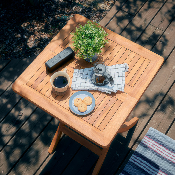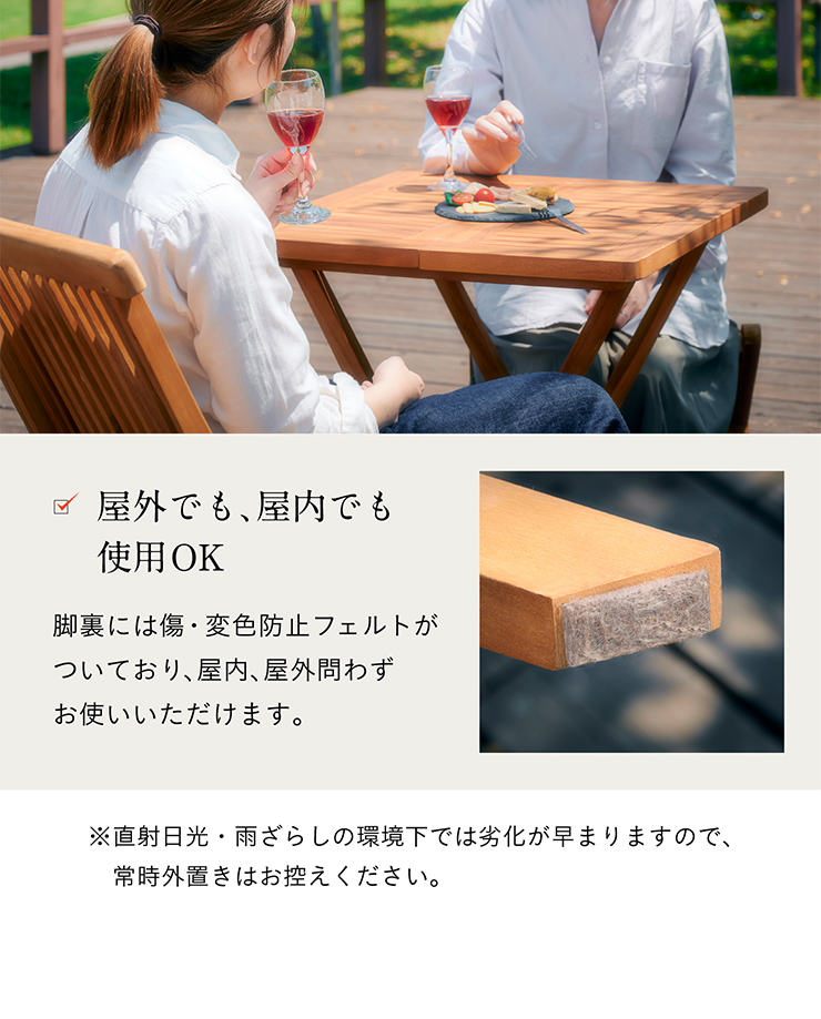 | ナチュラルな天然木のテーブル&チェアで庭先にカフェのような空間を。 Folding Table & Chair 3点セット 美しい木目のチーク材を、オイル塗装によって深みのある雰囲気に仕上げました。完成品なので、届いてからすぐにお使いいただけます。折りたたんでコンパクトに持ち運べる為、片付けたい時や持ち運ぶ際にとっても便利です。 ■自然の風合い溢れる天然木の「チーク材」 チーク材は高い防虫効果と優れた耐久性が人気の木材です。木の風合いをそのまま堪能できるオイル仕上げで、使い込むほど味が出る、経年変化もお楽しみいただけます。 ■場所を選ばず使いやすい、コンパクトな天板 天板は幅60cm、奥行60cmの2人で使用するのにぴったりなコンパクトサイズ。ちょっとしたスペースにも場所を取らずに設置できます。 ■ゆるやかにカーブしたスタイリッシュな脚 八の字型の脚部がアクセントに。すっきりとしたシルエットが、スタイリッシュな空間を演出してくれます。 ■男性もゆったり座れるサイズ感 高めの背もたれが身体にフィット。男性の方でも快適に座っていただけます。 ■通気性◎夏でも心地良く 座面、背もたれ共に格子状になって居るので、背中とお尻のムレを防いで快適にお過ごしいただけます。 ■持ち運びに便利な『折りたたみ式』 コンパクトに折りたたむことができるので、持ち運びや収納時にとっても便利。工具を使う組み立ては一切不要で、パッと開くだけで簡単にお使いいただけます。山や海へのレジャー、キャンプなどに持って行きたくなるアイテムです。 ■セットで使うことで、統一感のある空間に 同じチーク材のチェアを合わせて統一感のある空間に。温もり溢れる天然木がご自宅のテラスやベランダを素敵に演出します。 ■屋外でも、屋内でも使用OK 脚裏には傷・変色防止フェルトがついており、屋内、屋外問わずお使いいただけます。 ※若干の個体差によって、表記サイズと完成形のサイズに多少の誤差が生じる場合がございます。予めご了承ください。 ※こちらは、テーブル/チェアx2の3点セットでの販売となります。必ずセット内容をご確認ください。 ※常時外置きはお控えください。 ※直射日光・雨ざらしの環境下では劣化が早まりますので、屋根付きのテラス等でご使用ください。 | |