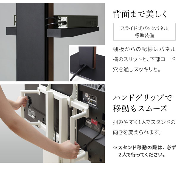 | 大型テレビが自由に置ける WALL V5 ロータイプ キャスター付き フラットベースそのまま美しくスムーズに移動 最大級の大型テレビに対応 80インチまで対応しています! お部屋に合わせて選べる3色 独特の表情の汚れや傷に強い「サテン塗装」を施しています。 便利な機能満載 配線を隠す背面収納スペース&自由に高さ調節可能な棚板! | |