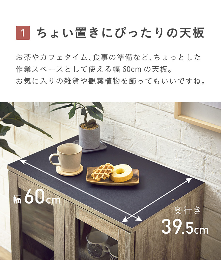 | 組み合わせ自由なキッチン収納シリーズ Kitchen storage mone(モーネ) Aタイプ ■お気に入りの食器や雑貨を『魅せる収納』ですっきり&お洒落に 透明なガラス扉は、よく使う食器の場所も一目瞭然。使いたい時にサッと取り出せるからとっても便利。お気に入りの食器や雑貨を収納しながら、ディスプレイとしても楽しめるキッチン収納です。 ■お部屋に馴染みやすいスタイリッシュな2tone color ヴィンテージ加工を施した立体感のある木目調のシートにブラックカラーのアクセント。他にない、スタイリッシュなアイテムに仕上げました。 ■一台でスッキリ。たっぷりの収納スペースで整理整頓 扉収納の中にある棚は可動式。高さが変えられるので、背の高いグラスや大きな調理器具などを置くことができます。 ■mone(モーネ)シリーズは全部で6タイプ パーツによって機能はさまざま。それぞれ違った特徴を持つ収納を組み合わせて、自分だけのオリジナル家具を作って見ませんか。欲しい機能やデザインからお選び下さい。 ※こちらの商品はお客様組み立てとなります。 ※組み立て方や若干の個体差によって、表記サイズと完成形のサイズに多少の誤差が生じる場合がございます。 ※熱いものを置くときは、直接置かないように注意してください。 ※防水ではございませんので、濡れた場合は放置せずすぐに拭き取ってください。 ※本商品の背面には塗装等の処理を行っておりません。ご了承の上、ご検討頂きますようお願い致します。 ※天板両端の2つの穴は連結する際、木ダボを差し込む為に使用するものです。 ※こちらの上下連結プレートは、耐震ではございません。家具の転倒がご心配の方は地震対策グッズなどを、ホームセンターなどでご購入くださいますようお願い致します。 | |