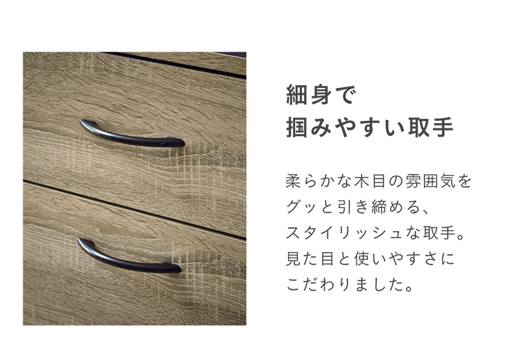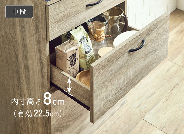 | 組み合わせ自由なキッチン収納シリーズ Kitchen storage mone D(モーネ D チェスト) ■3杯の引き出しで収納力たっぷり隠す収納で見た目スッキリ 小さなカトラリーから大きな調理器具まで、ごちゃつきがちなキッチンアイテムをしっかり分類。スッキリ収納することができる引出し収納です。 ■お部屋に馴染みやすいスタイリッシュな2tone color ヴィンテージ加工を施した立体感のある木目調のシートにブラックカラーのアクセント。他にない、スタイリッシュなアイテムに仕上げました。 ■充実の収納力。“浅い&深い”3杯の引出し 小さなカトラリーから大きな調理器具まで、種類に分けて収納できる3杯の引き出し。深めの下段引き出しには、ストック品やお鍋を入れるのにぴったりです。 ■mone(モーネ)シリーズは全部で6タイプ パーツによって機能はさまざま。それぞれ違った特徴を持つ収納を組み合わせて、自分だけのオリジナル家具を作って見ませんか。欲しい機能やデザインからお選び下さい。 ※こちらの商品はお客様組み立てとなります。 ※組み立て方や若干の個体差によって、表記サイズと完成形のサイズに多少の誤差が生じる場合がございます。予めご了承ください。 ※熱いものを置くときは、直接置かないように注意してください。 ※防水ではございませんので、濡れた場合は放置せずすぐに拭き取ってください。 ※本商品の背面には塗装等の処理を行っておりません。あらかじめご了承の上、ご検討頂きますようお願い致します。 ※こちらは下段専用の商品です。上下連結する際は、必ず下段での使用をお願い致します。 ※こちらの上下連結プレートは、耐震ではございません。家具の転倒がご心配の方は地震対策グッズなどを、ホームセンターなどでご購入くださいますようお願い致します。 | |