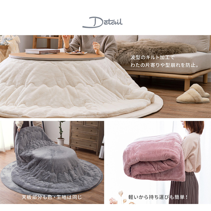 | とろけるような触れ心地 思わず触れたくなるようなふんわりなめらかタッチのこたつ布団! 収納もしやすい薄掛けタイプです。波型縫製で中わたが片寄るのを防ぎます。 また、汚れても洗えるためいつも清潔にお使いいただけます。 サイズはスクエアタイプとサークルタイプ、合わせて3サイズからお選びいただけます。 洗濯機OK ※品質表示では洗濯不可の表示になっている場合がございますが、洗濯可能です。 | |