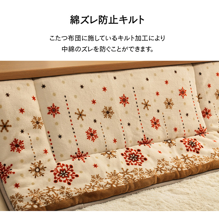| ■可愛らしいノルディック柄のコンパクト省スペースこたつ布団です。 ■サンゴマイヤー生地で、冬にぴったりなあったか商品。裏面タレ部もフリース素材であたたかさにこだわりました。 ■中綿のズレを防ぐキルト加工を施しています。 ※詳細画像をご確認ください。 ※液温は40℃を限度とし、手洗いができる。日陰のつり干しがよい。 ※こたつ台、こたつ敷き布団は別売りです。 ※掲載写真は表記サイズと異なる場合がございます。 ※ふとんをやぐらの中に押し込んだり、座イスやイス全体をこたつの中に入れたまま使用しないでください。ふとんがヒーターに当たらないようにご使用ください。(火災の原因になります) ご使用により、ふとんが焦げた場合につきましては、返品・交換を承ることができませんので、あらかじめご了承ください。 ※画面上のカラーはご使用ブラウザやモニターの設定により、実物とは若干異なる場合がございます。あらかじめご了承の上、ご注文をお願いいたします。 | |