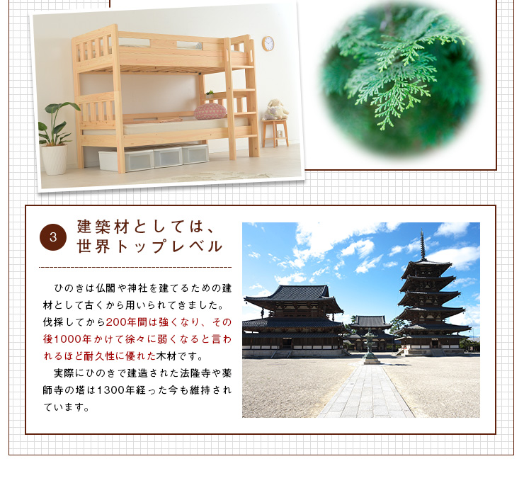 | マットレスセット 国産 二段ベッド 檜(ひのき) + 日本製マットレス トコマットSSS 高さ低めのロータイプ。シンプルフォルムで、コンパクト設計。カラーは、ナチュラルとナチュラル/ブラウンの2色をご用意しました。シングルベッド2台としても使えます。有害物質を含まない身体に優しい植物系自然塗料(F★★★★)を使用。 ■年中快適、本桐すのこを採用 手間とコストをかけた自信作、木製の開き止めが付いてます。あえて加工時間もコストもかかる木製タイプで作製。開き止めとスノコ上板を支えるW機能を有し、木の温もりを感じることができます。 ■転落や布団のずりおちを支える取り外し可能なサイドフレーム付き。シングルベッドにした際にはサイドフレームを取り外すことができます。 ■省スペースなはしご はしごは、本体に固定するタイプなので上段と下段の固定力も高めます。場所をとらず省スペース。さらに、上り下りがしやすいように入り口を確保しました。ステップもフラットタイプなので、安心して使用できます。 ■便利な宮棚付き 必要なものをスッキリ置ける、5.8x76cmのスリムな宮付き。 ■ベッド下も有効活用 上下段の空間高を保ちつつ床下の有効利用。また、掃除もしやすいちょうどいい高さ。圧迫感なくお部屋もすっきり広々。 ■安全な角丸加工 全面の角を削り、丸みをもたせました。そうすることにより安全性を高め、触れた感触も向上、手触り滑らかな設計です。 ※こちらの商品はお客様組み立てとなります。 ※組み立て方や若干の個体差によって、表記サイズと完成形のサイズに多少の誤差が生じる場合がございます。 | |