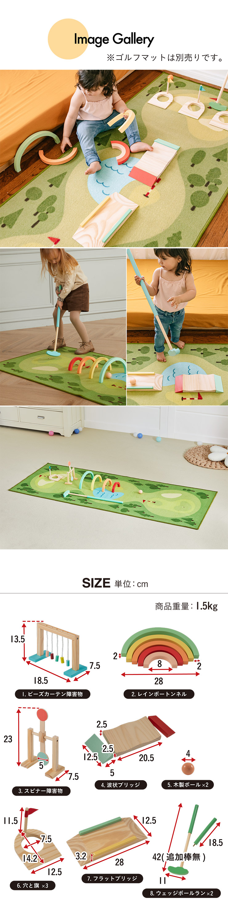 | Good Wood Golf Game(木製ゴルフゲーム) 自分でコースを作って遊べる木製ゴルフゲームセット 『Good Wood Golf Game』は、室内で楽しめるゴルフゲームです。コースの難易度は自由自在。トンネルや障害物などのパーツを組み合わせて、自分たちだけのお気に入りのコースを作ることができます。 ■5つのおすすめPoint 1..充実の8点セット 2..創造力を育む木製玩具 3..親子.兄弟.お友だちと一緒に楽しめる 4..こだわりのデザイン 5..別売りの専用マットでさらに楽しく 〈注意事項〉 ※こちらの商品はお客様組み立てとなります。 ※組み立て方や若干の個体差によって、表記サイズと完成形のサイズに多少の誤差が生じる場合がございます。 〈保護者の方へ〉 ・遊ぶときは、保護者の方と一緒に遊んでください。 ・誤飲の危険がございますので対象年齢未満のお子さまには絶対に与えないでください。 ・食べ物ではありません。誤って飲み込まないよう注意してください。 ・安全のため、破損したり、変形したおもちゃは使用しないでください。 ・本製品は、屋内専用です。屋外には設置しないでください。また、水平な場所に設置してください。 ・お子さまの1人遊びは危険です。必ず保護者のもとで遊ばせてください。 ・組み立ては大人の方が行い、遊ぶ前には必ず点検を行ってください。 ・お子さまが遊ぶ際には、完全に組み立てた状態でご使用ください。 〈木製品について注意〉 木材の性質上、「ひび割れ」・「欠け」・「めくれ」・「変形」・「反り」などが発生する場合がございます。木製品は天候・湿度ににより伸縮しているため、サイズや重量に多少の誤差が生じます。 | |