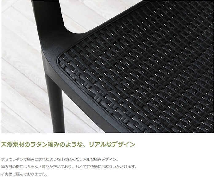 | 屋外対応のラタン調1人掛けガーデンチェア。 室内はもちろんガーデンやベランダ、テラスでの使用に最適です。 アーム付きなので、ゆったりとリラックスしてお座りいただけます。 まるでラタンで編みこまれたような手の込んだリアルなデザイン。※実際に編んでおりません。 使わないときはスタッキングできて収納場所を取りません。 1脚販売と、お得な4脚セット販売がございます。 ※こちらの商品はお客様組立となります。 ※詳細画像をご確認ください。 | |