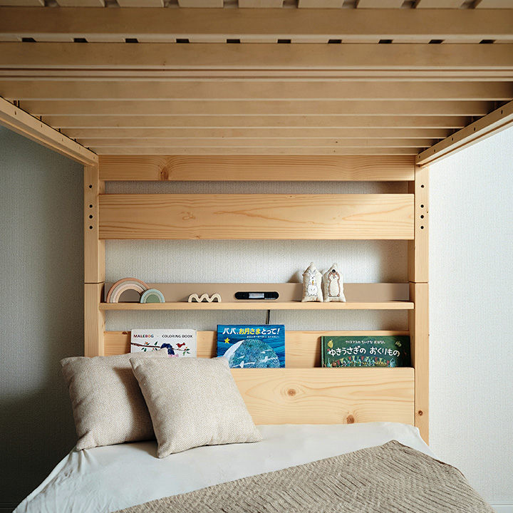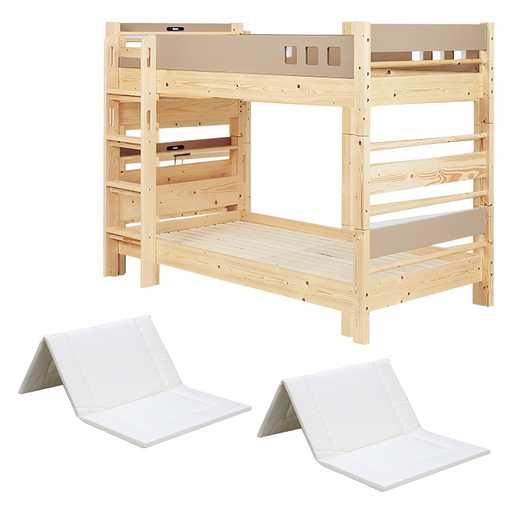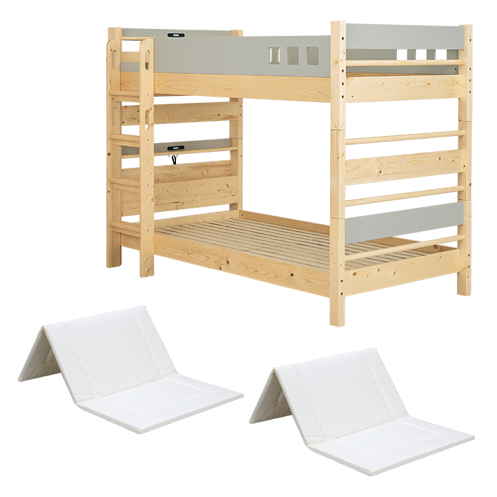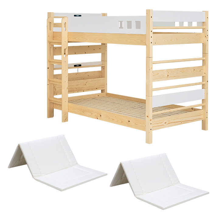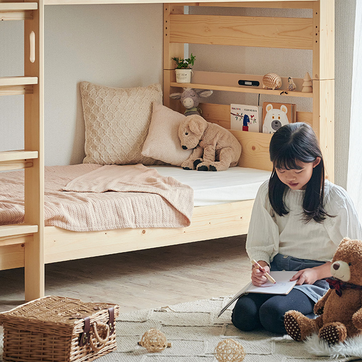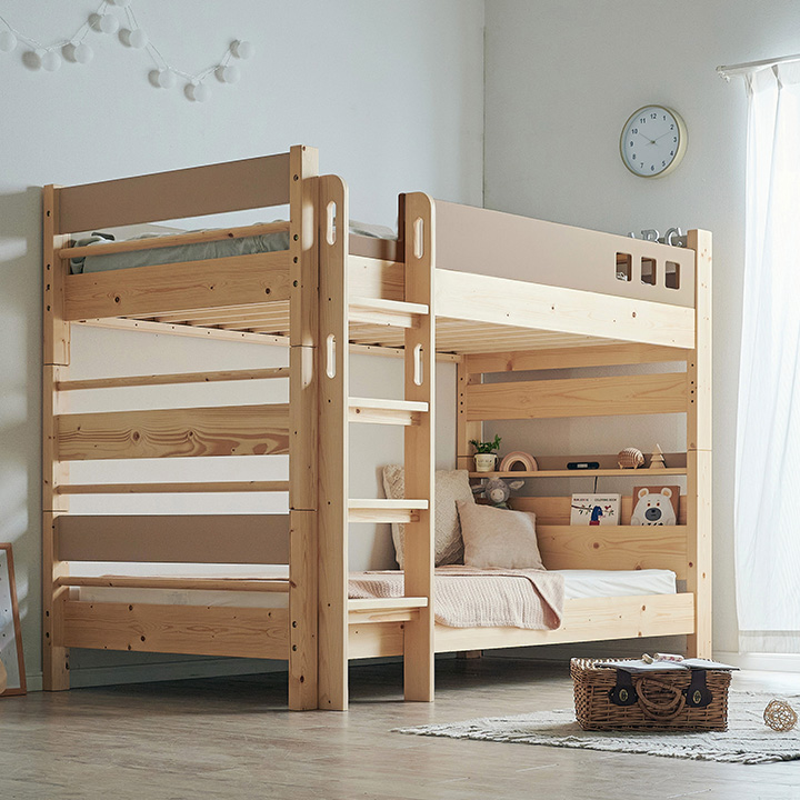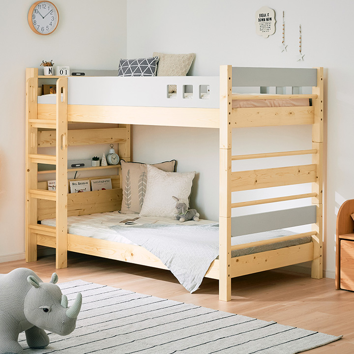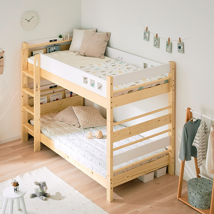 bunk bed atte(アッテ) 天然木の中でぐっすり、優しいカラーの2段ベッド シンプルなデザインに「LEDライト」や「コンセント」、「本立て」など、うれしい機能が盛りだくさん。シングルベッドとしても使える分割式で大きくなっても使えます。くすみカラーがポイントの4色からお選びいただけます。 ■natural wood 木のぬくもりを感じる居心地の良いベッド 木のぬくもりを感じられるよう、材質にパインの無垢材や突板を使用し、居心地の良い空間に。優しいナチュラルカラーに入った明るすぎないくすみカラーが、落ち着きのあるおしゃれなお部屋を演出してくれます。 ■広い下段スペース 下段高を低く設計しているので、小さなお子さまでも出入りが簡単。空間高が広いので成長してからも頭をぶつけにくく、ゆったりとした広い空間を確保することができます。 ■便利な宮棚 宮棚には、コンセント・LEDライトが上段と下段のどちらにも付いており、それぞれが好きなものを置くことができます。 コンセント:500Wまでご使用可能 LEDライト:電球は長寿命で明るいLEDを採用。 ■宮棚の下も有効活用 本の表紙を見せて収納できる本立てをつけました。タブレットの収納可能です。 ■分割仕様で長く使える 上段、下段を分割できるので、2つのシングルベッドとしても使えます。ライフスタイルやお子さまの成長に合わせて長く使うことができる2段ベッドです。 ■省スペースで使いやすく、耐震効果も上げる「固定式垂直はしご」 場所を取らないのでお部屋を広くお使いいただけます。固定式のはしごは、ぐらつきや転倒を防ぐとともに、上段と下段の固定力を高める効果も。 ■お部屋に合わせてヘッド・フットの位置を変えることができます。 ※はしごの位置は固定となります。 ※象段・下段のヘッドボードは同じ側のみ設置可能です。 ■遊び心のあるサイドフレーム 四角い窓がアクセントのサイドフレームは、他にはないオリジナルデザイン。 ■通気性のいいLVLすのこ 風の通り道を確保することでカビやダニの繁殖を防ぎます。 ■安心の角丸仕様 普段ご使用いただく際の危険を少しでも取り除くために、角はすべて面取り加工を施しています。 ※自然の風合いを生かしたパイン材には節が多くみられます。節の隙間やひび割れ等には手入れをおこなっておりますが、節を理由とした返品・交換は対象外となりますので、予めご了承ください。 ※こちらの商品はお客様組み立てとなります。 ※組み立て方や若干の個体差によって、表記サイズと完成形のサイズに多少の誤差が生じる場合がございます。予めご了承ください。 ※こちらの商品はお客様組み立てとなります。 | |