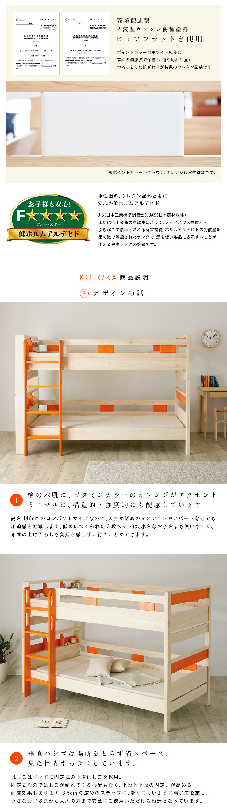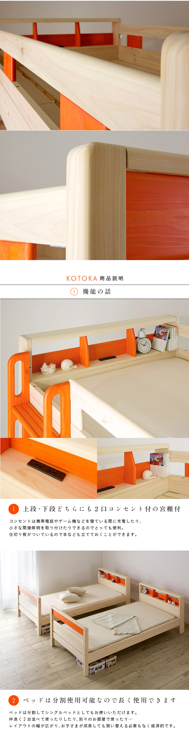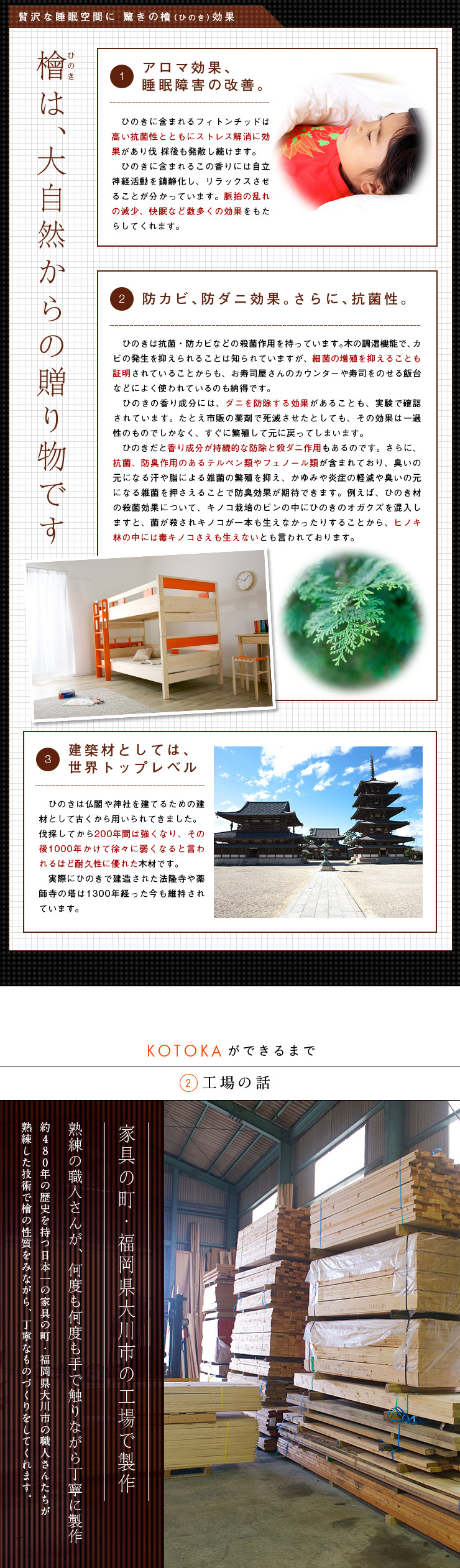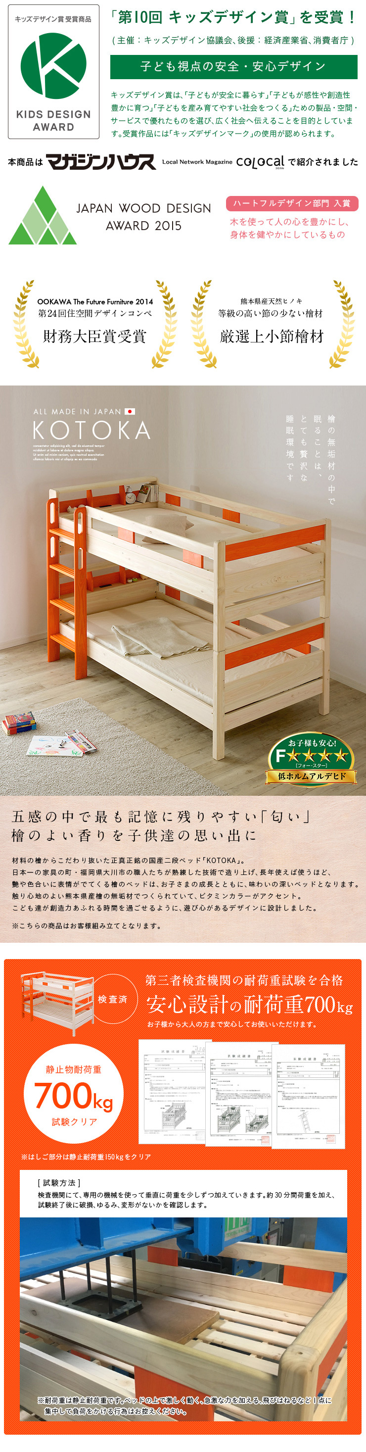 | 「OOKAWA The Future Furniture 2014 第24回 住空間デザインコンペ」 財務大臣賞受賞 檜の無垢材の中で眠ることは、とても贅沢な睡眠環境です。 五感の中で最も記憶に残りやすい「匂い」 檜のよい香りを子供たちの思い出に 材料の檜からこだわり抜いた正真正銘の国産2段 ベッド「KOTOKA」。日本一家具の町・福岡県大川市の職人たちが熟練した技術で造り上げ、長年使えば使うほど、艶や色合いに表情がでてくる檜のベッドはお子様の 成長とともに、味わい深いベットとなります。肌触りの心地よい熊本県産檜の無垢材でつくられていて、ビタミンカラーがアクセント。子供たちが想像力あふれる時間を過ごせるように、遊び心があるデザインに設計しました。 ○「KOTOKA」 ができるまで 1.材料 熊本県産檜 節の少ない等級の「上小節」をさらに選別した高品質の檜材贅沢な睡眠空間に 驚きの檜(ひのき)効果 ・アロマ効果、睡眠障害の改善 ・防カビ、防ダニ効果。さらに、抗菌性 ・建築材としては、世界トップレベル 2.工場 家具の町 福岡県大川市の工場で制作 熟練の職人さんが、何度も何度も手で触りながら丁寧に制作。約480年 の歴史を持つ日本一の家具の町、福岡県大川市の職人さんたちが熟練した技術で檜の性質を見ながら、丁寧なものづくりをしてくれます。 ○商品説明 1スノコ 通気性抜群の国産高品質桐スノコ 2.水性塗料 次世代スタンダード水系塗料のアクレックスを使用 低ホルムアルデヒドF★★★★ 3.デザイン 檜の木肌に、ビタミンカラーのオレンジがアクセント。ミニマルに、構造的・強度にも配慮しています 4.機能 ・上段、下段どちらにも2口 コンセント付の宮棚 ・ベッドは分割使用可能なので長く使用できます ・ 段の高さが調節可能です(シングル時も可) ※針葉樹である檜には節が必ず存在します。節を理由とした返品・交換は対象外となります。 ※こちらの商品はお客様組立となります | |