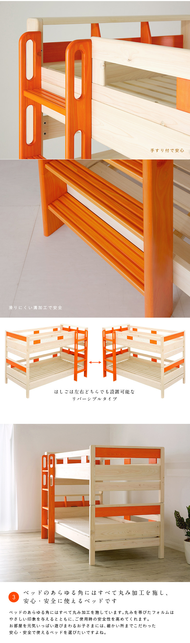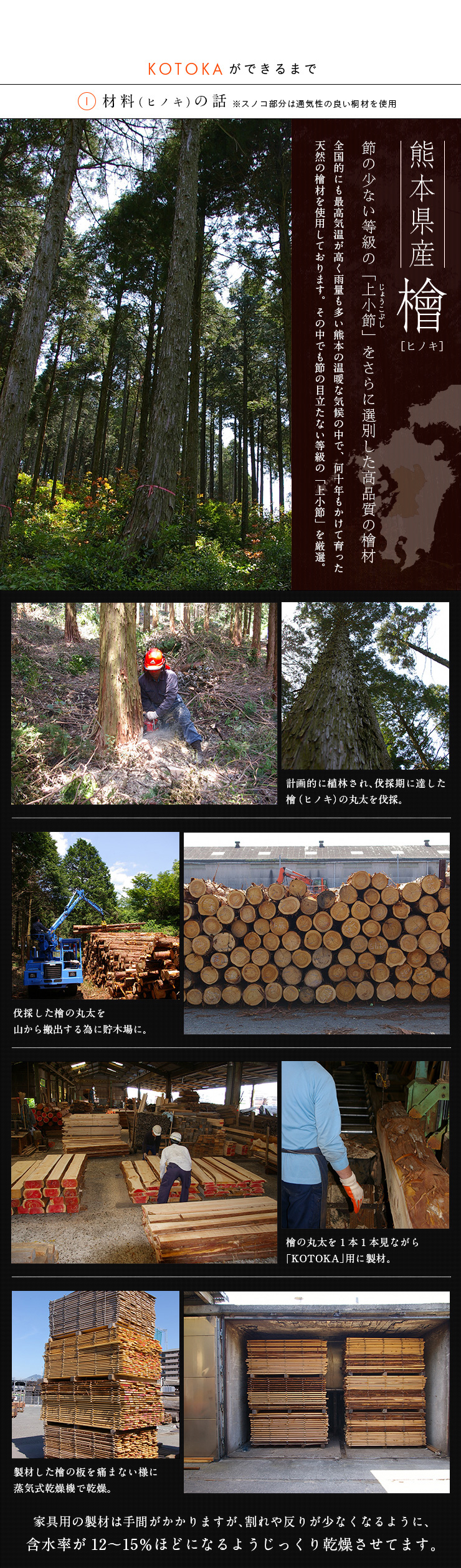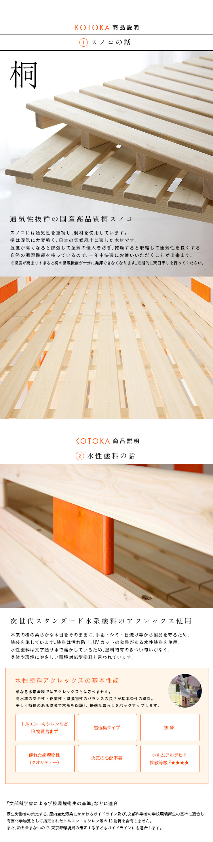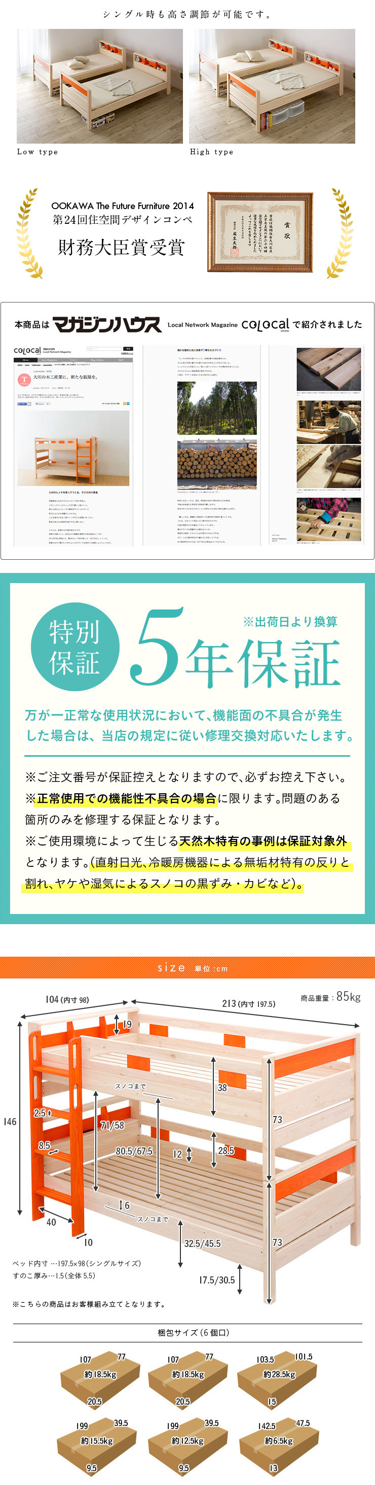 | 「OOKAWA The Future Furniture 2014 第24回 住空間デザインコンペ」 財務大臣賞受賞 檜の無垢材の中で眠ることは、とても贅沢な睡眠環境です。 五感の中で最も記憶に残りやすい「匂い」 檜のよい香りを子供たちの思い出に 材料の檜からこだわり抜いた正真正銘の国産2段 ベッド「KOTOKA」。日本一家具の町・福岡県大川市の職人たちが熟練した技術で造り上げ、長年使えば使うほど、艶や色合いに表情がでてくる檜のベッドはお子様の 成長とともに、味わい深いベットとなります。肌触りの心地よい熊本県産檜の無垢材でつくられていて、ビタミンカラーがアクセント。子供たちが想像力あふれる時間を過ごせるように、遊び心があるデザインに設計しました。 ○「KOTOKA」 ができるまで 1.材料 熊本県産檜 節の少ない等級の「上小節」をさらに選別した高品質の檜材贅沢な睡眠空間に 驚きの檜(ひのき)効果 ・アロマ効果、睡眠障害の改善 ・防カビ、防ダニ効果。さらに、抗菌性 ・建築材としては、世界トップレベル 2.工場 家具の町 福岡県大川市の工場で制作 熟練の職人さんが、何度も何度も手で触りながら丁寧に制作。約480年 の歴史を持つ日本一の家具の町、福岡県大川市の職人さんたちが熟練した技術で檜の性質を見ながら、丁寧なものづくりをしてくれます。 ○商品説明 1スノコ 通気性抜群の国産高品質桐スノコ 2.水性塗料 次世代スタンダード水系塗料のアクレックスを使用 低ホルムアルデヒドF★★★★ 3.デザイン 檜の木肌に、ビタミンカラーのオレンジがアクセント。ミニマルに、構造的・強度にも配慮しています 4.機能 ・上段、下段どちらにも2口 コンセント付の宮棚 ・ベッドは分割使用可能なので長く使用できます ・ 段の高さが調節可能です(シングル時も可) ※針葉樹である檜には節が必ず存在します。節を理由とした返品・交換は対象外となります。 ※こちらの商品はお客様組立となります | |