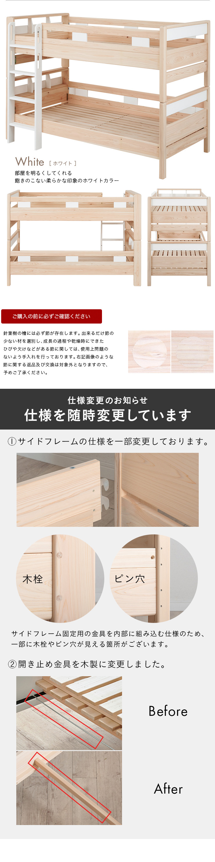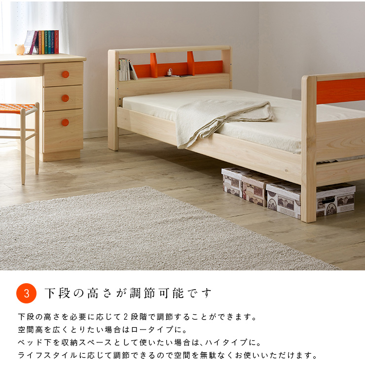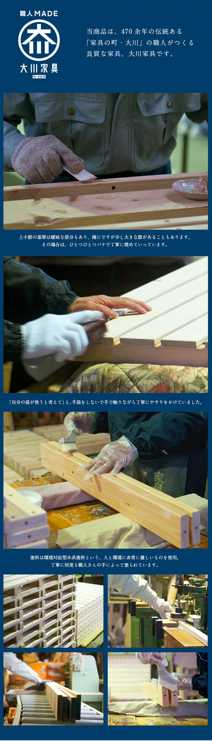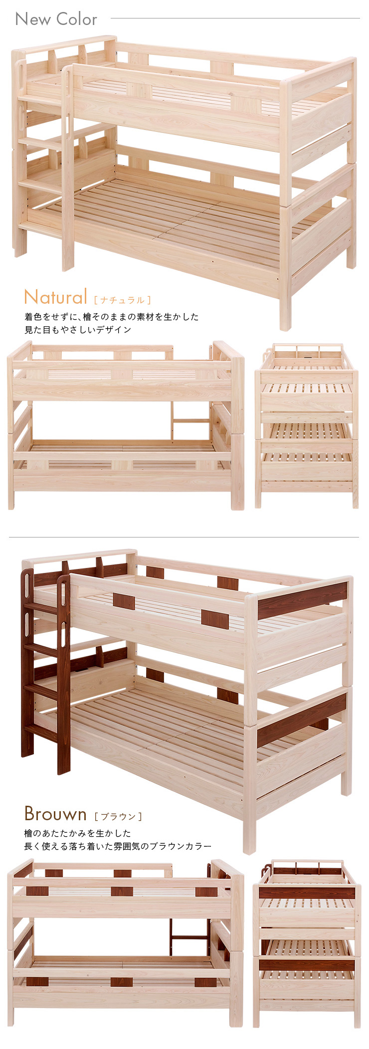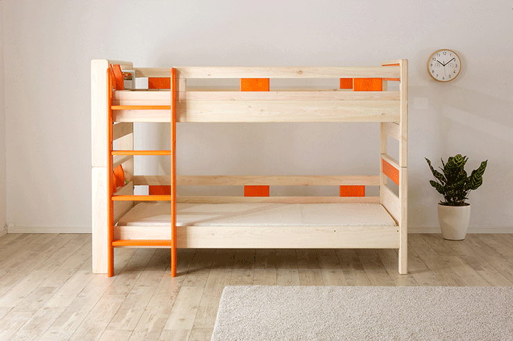 | 「OOKAWA The Future Furniture 2014 第24回 住空間デザインコンペ」 財務大臣賞受賞 檜の無垢材の中で眠ることは、とても贅沢な睡眠環境です。 五感の中で最も記憶に残りやすい「匂い」 檜のよい香りを子供たちの思い出に 材料の檜からこだわり抜いた正真正銘の国産2段 ベッド「KOTOKA」。日本一家具の町・福岡県大川市の職人たちが熟練した技術で造り上げ、長年使えば使うほど、艶や色合いに表情がでてくる檜のベッドはお子様の 成長とともに、味わい深いベットとなります。肌触りの心地よい熊本県産檜の無垢材でつくられていて、ビタミンカラーがアクセント。子供たちが想像力あふれる時間を過ごせるように、遊び心があるデザインに設計しました。 ○「KOTOKA」 ができるまで 1.材料 熊本県産檜 節の少ない等級の「上小節」をさらに選別した高品質の檜材贅沢な睡眠空間に 驚きの檜(ひのき)効果 ・アロマ効果、睡眠障害の改善 ・防カビ、防ダニ効果。さらに、抗菌性 ・建築材としては、世界トップレベル 2.工場 家具の町 福岡県大川市の工場で制作 熟練の職人さんが、何度も何度も手で触りながら丁寧に制作。約480年 の歴史を持つ日本一の家具の町、福岡県大川市の職人さんたちが熟練した技術で檜の性質を見ながら、丁寧なものづくりをしてくれます。 ○商品説明 1スノコ 通気性抜群の国産高品質桐スノコ 2.水性塗料 次世代スタンダード水系塗料のアクレックスを使用 低ホルムアルデヒドF★★★★ 3.デザイン 檜の木肌に、ビタミンカラーのオレンジがアクセント。ミニマルに、構造的・強度にも配慮しています 4.機能 ・上段、下段どちらにも2口 コンセント付の宮棚 ・ベッドは分割使用可能なので長く使用できます ・ 段の高さが調節可能です(シングル時も可) ※針葉樹である檜には節が必ず存在します。節を理由とした返品・交換は対象外となります。 ※こちらの商品はお客様組立となります | |