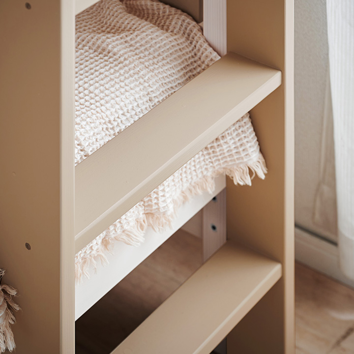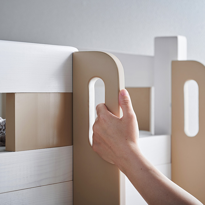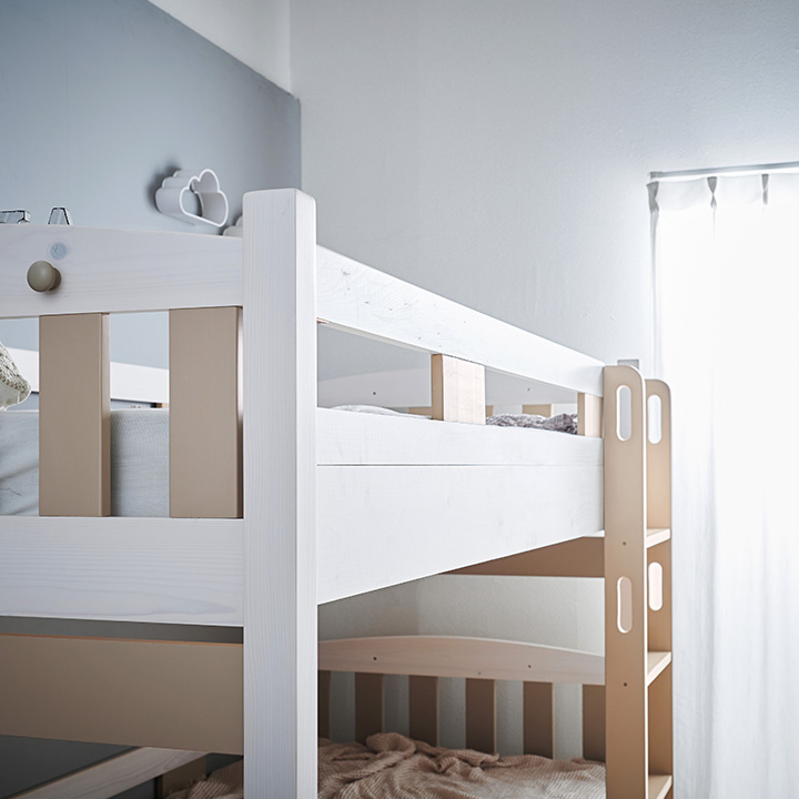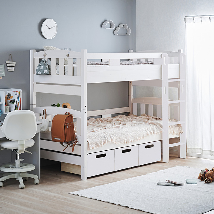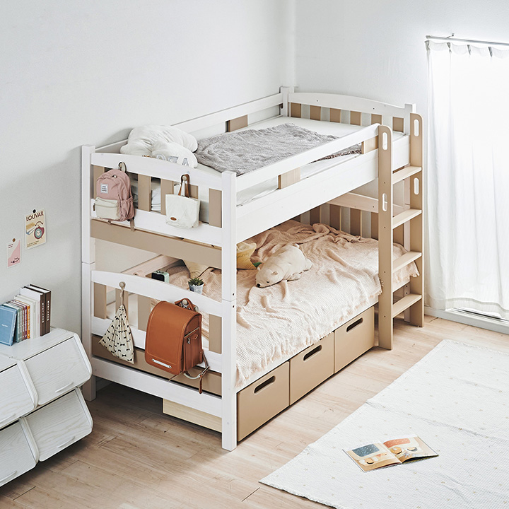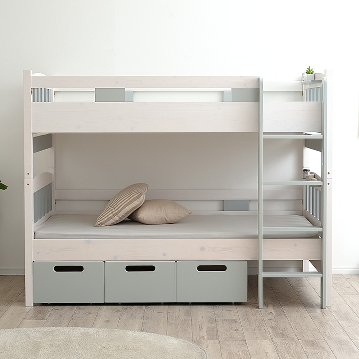 NETFLIX「新聞記者」に美術協力いたしました お部屋にぬくもりを与えるカントリー調2段ベッド Bunk bed EMMA(エマ) ■Design 落ち着いたカントリー調デザイン カントリー調デザインがお部屋にぬくもりを与える2段ベッド。余計な装飾のないスマートデザインなので、大人になっても飽きずに長く使うことが出来ます。 ■Function 「使いやすい」をカタチにした2段ベッド 001...ベッド下を有効に使える引出し 002...便利なフック&スマートな宮棚 003...省スペースでコンパクトな垂直ハシゴ ■Useful 高さ調節&シングル使用可能 下段だけでなく、上段も2段階に高さ調節可能。圧迫感をなくしたい方や、ロータイプがお好みの方もお使いいただけます。好みやライフスタイルに合わせて高さを選べるのが嬉しいですね。大人になったら、シングルベッドにして別々のお部屋に置いてもOK。ベッドを買い替える必要がないのでとっても経済的。シングル時ももちろん高さ調節ができ、いつでも自分に合ったスタイルでお使いいただけます。 ■Color 長く使えて飽きのこない3color ホワイトウォッシュを基調としたカラーは、お部屋に清潔感とぬくもりをプラスします。大きくなっても長く使える清潔感のあるホワイト、シックでモダンなグレー、やさしく温かみのあるサンドベージュの3カラーからお選びください。 ■Material ぬくもり溢れるフィンランド産パイン材を使用 厳しい寒さの中で育った、美しい年輪ときめ細やかな木肌が特徴のフィンランド産パイン材。節や木目がお部屋に温かみを与え、パインならではの手触りや木の質感をお楽しみいただけます。 ※ご確認をお願いします 自然の風合いを生かしたパイン材には節が多くみられます。節の隙間やひび割れ等には手入れを行っておりますが、節を理由とした返品・交換は対象外となりますので、予めご了承ください。 ■Safety 安心して使えるこだわりの設計 ・通気性に優れたLVLスノコ ・縦揺れに備えた耐震設計 ・やんちゃなお子さまでも安心の角丸加工 ※こちらの商品はお客様組み立てとなります。 ※はしごは写真のように右側のみ取り付け可能です。左側には配置できませんので、ご注意ください。 ※設計の都合上、上段サイドフレームを1段目(上)に設定した場合、はしごの最上部ステップとの間に隙間が生じます。気になる方は、上段サイドフレームを2段目(下)に設定してご使用ください。 | |