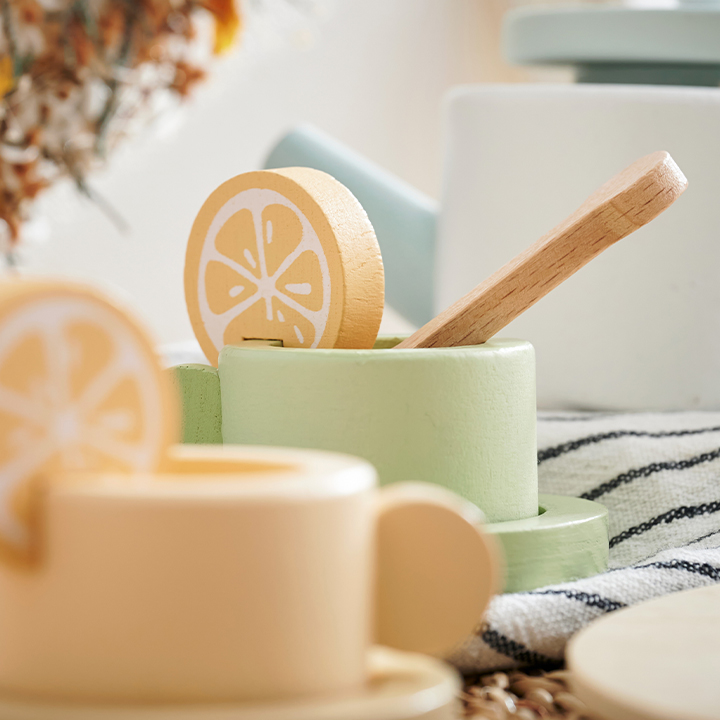 | F・O・International Afternoon tea(アフタヌーンティー) 木のぬくもりとくすみカラーが可愛いアフタヌーンティーのおままごとセット ティーポットはもちろん、レモンやティーバッグの部品もあるので、ごっこ遊びのイマジネーションが広がります♪同シリーズの「デザートタワー(別売り)」と一緒に遊ぶと、ティーパーティーが盛り上がること間違いなし! ■ティーバッグを使って紅茶をつくろう カップにセットのティーバッグを入れて、ポットのお湯を注いでみよう! ■レモンをカップに乗せてレモンティーの出来上がり レモンの輪切りをカップに乗せればおしゃれなレモンティーに。 ■お皿に乗せて運んだらティータイム開始! セットのお皿にカップやお砂糖を乗せてテーブルへ運んだら、たのしいティータイム♪} ■砂糖、はちみつ、コーヒー、お茶っ葉のボトル コーヒーや緑茶を飲みたくなったら、ボトルからスプーンで取り出すまねっこ!甘さが足りない時は砂糖orはちみつを入れてね。 ※若干の個体差によって、表記サイズと完成形のサイズに多少の誤差が生じる場合がございます。 ※小さな部品があります。口の中には絶対に入れないでください。窒息などの危険があります。 ※誤飲の危険がありますので、4才未満のお子様には絶対に与えないでください。 ※保護者のもとで遊ばせてください。 ※転落の恐れのある場所、傾斜のある場所、火気のある場所では絶対に使用しないでください。安全な場所で遊んでください。 ※隙間には指を入れないでください。はさまれて怪我をする恐れがあります。 ※安全のため、破損、変形したおもちゃは使用しないでください。 ※投げたり、ぶつけたり、ふりまわすなど乱暴な遊びをしないでください。 ※各パーツにトゲやバリが残っている場合は、きれいに取り除き安全を確認してからご使用ください。 ※廃棄するときは、自治体の廃棄処理の指示に従ってださい。 ※高温多湿の場所、日光のあたる場所での保管はしないでください。 ※火気や暖房器具の近くでの使用、 保管は絶対に避けてください。火傷や火事の原因になります。 ※汚れを落とす場合は、水または薄めた中性洗剤を軽く含ませ、かたく絞った布で表面を拭き取ってください。 ※梱包材に使用しております袋、固定具は開封後すぐに捨ててください。 ※商品をご使用される前に注意文や取扱い説明などをよく読んでください。パッケージ(箱)は捨てずに保管をしてください。 ※実際の商品とパッケージの写真、イラストが多少異なることがあります。またお買上時期によって同一商品のなかにも多少異なるものがこざいます。 | |