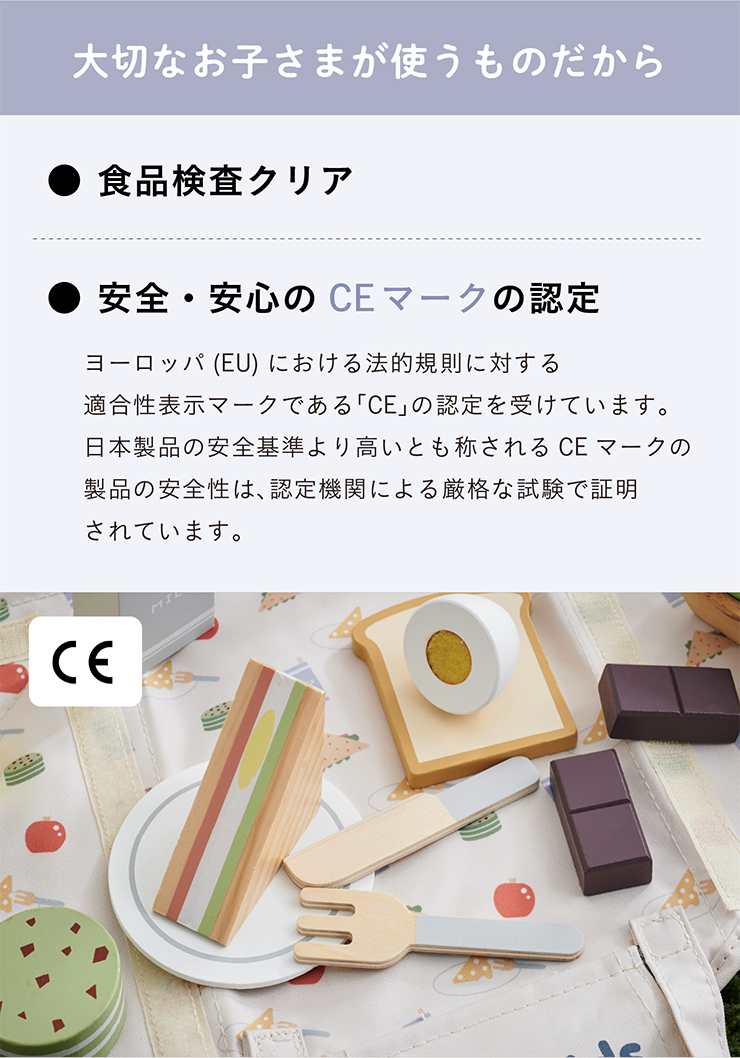 | F・O・International Picnic set ピクニックセット 木のぬくもりとくすみカラーが可愛い♪ピクニックのおままごとセット 広げるとシートになる可愛いピクニックバッグの中には、気分がウキウキするおもちゃの食材がたくさん♪卵、リンゴ、ラフランスは面ファスナーがついており、ナイフでカットする遊びも楽しめます。 ■お皿に盛り付けて「召し上がれ♪」 好きな物を選んでお皿にかわいく盛り付けよう。ナイフとフォークを持って「いただきます」♪ ■「サクッ」と切る感触を楽しめる面ファスナー 卵、リンゴ、ラフランスには面ファスナーが付いているので、何度も食材を切って遊べるよ! ■どっちを飲む?ミルク or オレンジジュース のどが渇いたらジュースを飲んでひとやすみ。ジュースのおもちゃのストローは、口に入れても大丈夫な優しい素材だからママも安心! ■遊び終わったら専用バッグへお片付け 遊び終わったらシートをたたんでバッグをつくって、おもちゃを中に片付けよう。収納する時もかさばらないのでとっても便利です。 ■おままごとがもっと楽しくなる2wayピクニック専用バッグ かわいいイラストが入ったバッグを広げるとレジャーシートに変身。遊ぶときはバッグを広げてレジャーシートとして、遊び終わったらお片付け用のバッグとして大活躍♪レジャーシートからバッグへ変えたいときは、面ファスナーとドットボタンを組み合わせながら折るとバッグの形になります。 ※若干の個体差によって、表記サイズと完成形のサイズに多少の誤差が生じる場合がございます。 ※小さな部品があります。口の中には絶対に入れないでください。窒息などの危険があります。 ※誤飲の危険がありますので、4才未満のお子様には絶対に与えないでください。 ※保護者のもとで遊ばせてください。 ※転落の恐れのある場所、傾斜のある場所、火気のある場所では絶対に使用しないでください。安全な場所で遊んでください。 ※隙間には指を入れないでください。はさまれて怪我をする恐れがあります。 ※安全のため、破損、変形したおもちゃは使用しないでください。 ※投げたり、ぶつけたり、ふりまわすなど乱暴な遊びをしないでください。 ※各パーツにトゲやバリが残っている場合は、きれいに取り除き安全を確認してからご使用ください。 ※廃棄するときは、自治体の廃棄処理の指示に従ってださい。 ※高温多湿の場所、日光のあたる場所での保管はしないでください。 ※火気や暖房器具の近くでの使用、 保管は絶対に避けてください。火傷や火事の原因になります。 ※汚れを落とす場合は、水または薄めた中性洗剤を軽く含ませ、かたく絞った布で表面を拭き取ってください。 ※梱包材に使用しております袋、固定具は開封後すぐに捨ててください。 ※商品をご使用される前に注意文や取扱い説明などをよく読んでください。パッケージ(箱)は捨てずに保管をしてください。 ※実際の商品とパッケージの写真、イラストが多少異なることがあります。またお買上時期によって同一商品のなかにも多少異なるものがこざいます。 | |