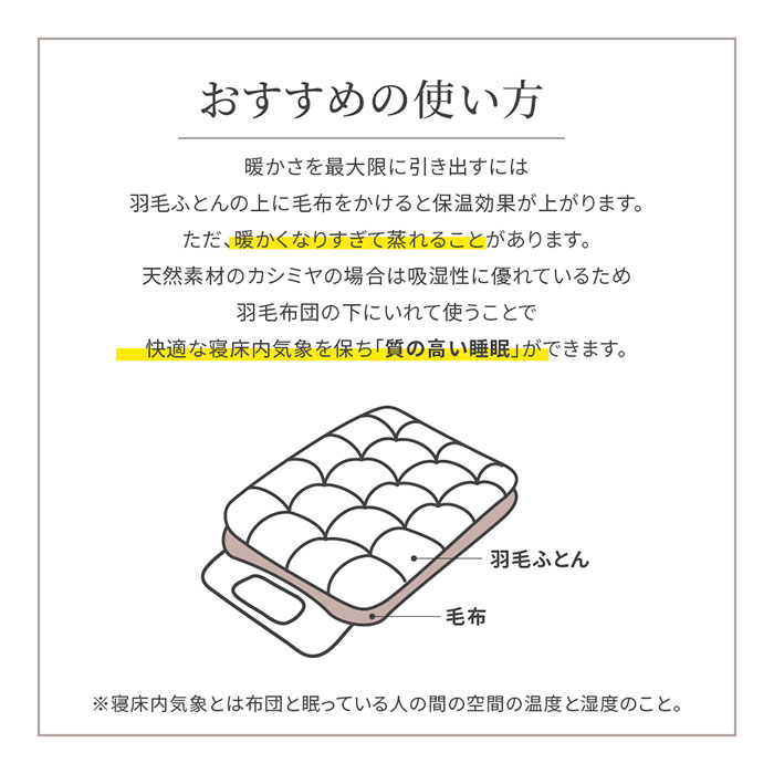 | 【1】繊維の宝石」と呼ばれる理由。カシミヤ山羊は中央アジアの高原など、厳しい自然環境で放牧に近い形で飼育されています。そのため寒気や乾燥に強い耐久力を持ち、環境に順応した毛質になっています。 【2】使うたびにやわらかくなる肌ざわり。天然素材であるカシミヤ繊維。細くしなやかで、皮膚刺激の少ない繊維です。カシミヤに含まれた油分が独特のなめらかさと柔らかさを醸します。 【3】優れた保温性。カシミヤは繊維の中でも最も保温性が高い素材。ウールよりも繊維が細く、高密度なので空気を逃がしにくく暖かい空気を取り込むことができるため、優れた保温性が保てます。 【4】蒸れにくくさらっと快適。カシミヤのもうひとつの優れた機能、それは吸湿性です。寝ている時にかく汗はコップ1杯分、吸湿性が高く発散性にも優れているから、蒸れずにさらっと快適。カシミヤの吸湿率:ポリエステルの40倍、アクリルの7倍、コットンの2倍 【5】毛布のまち 泉州「泉大津」 で作られています。国産毛布90%を生産している大阪府泉大津市。 獣毛毛布では、紡毛、織り、起毛と各工程で高度な技術を誇る職人達が、プライドを持って作っています。 日本毛布組合に属し品質基準に沿った、安心安全の日本製で商品づくりをしている工場で作られています。 【6】おすすめの使い方。暖かさを最大限に引き出すには羽毛ふとんの上に毛布を掛けると保温効果が上がります。ただ、暖かくなりすぎて蒸れることがあります。 天然繊維のカシミヤの場合は吸湿性に優れているため羽毛ふとんの下に入れて使うことで快適な寝床内気象を保ち「質の高い睡眠」ができます。 【7】長くご愛用していただくために ●カシミヤの風合いを損なわないために、水洗いは避けていただき、洗濯はドライクリーニング石油系をおすすめいたします。 ●タンブラー乾燥は避け、自然乾燥で形を整えて陰干ししてください。 ●時々2~3時間の陰干しをして、ブラシで毛並みを整えてください。 【8】良い素材のモノをリーズナブルに 「ちょっといいモノ」を手にして感じて貰いたい、 天然素材の良さを知ってもらいたい、 そんな想いで立ち上げたブランド 「イエオイエア_ieoiea.」からお届けします。 ※収納ケース付き ※詳細画像をご確認ください。 | |