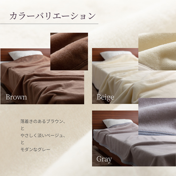 | 【1】おうちで手軽に洗えます。ウール毛布の優れた特徴を活かしたまま、ご家庭で洗濯できるように防縮加工を施しているため、水に浸すと毛が絡まり、フェルト状になって硬く縮んでしまうことを防ぎます。汚れや匂いが気になった時に、いつでも洗えます。 【2】やさしいあたたかさ。ウールは高い保温性に優れています。特有の縮れた繊維が複雑に絡み合い、空気の層をつくり、外の寒さをシャットアウト。ぽかぽかしたあたたかさがあなたを包み込みます。 【3】吸放湿性に優れた快適素材。ウールの知られざる機能のひとつに湿気を大量に吸収し、大気中に放出される優れた吸放湿性があります。寝汗をかいてもムレずにいつも快適。 蒸し暑くて蹴飛ばして、寝冷えするということもありません。 ウールの吸湿率:ポリエステルの40倍、アクリルの7倍、コットンの2倍 【4】やさしい肌ざわり。ウールはチクチクして痛そう・・・というイメージを持たれている方も多いのでは?イエオイエアのウール繊維は細かくて長いウールを使用。だから柔らかさもあり肌にやさしい感触を与えます。 【5】汚れがつきにくい。ウールは天然の防護外装あるため水分を弾く撥水性にも優れています。だから汚れも浸透しにくくなります。 【6】防臭機能。ウールの表面を覆うエピキューティクルには、表面水分が残りにくい撥水機能があります。そのためニオイの原因となるバクテリアや菌の繁殖も起きにくいのです。 【7】カラーバリエーションはブラウン、グレー、ベージュの3色展開。 【8】毛布のまち 泉州「泉大津」 で作られています。国産毛布90%を生産している大阪府泉大津市。 獣毛毛布では、紡毛、織り、起毛と各工程で高度な技術を誇る職人達が、プライドを持って作っています。 日本毛布組合に属し品質基準に沿った、安心安全の日本製で商品づくりをしている工場で作られています。 【9】おすすめの使い方。暖かさを最大限に引き出すには羽毛ふとんの上に毛布を掛けると保温効果が上がります。ただ、暖かくなりすぎて蒸れることがあります。 天然繊維のウールの場合は吸湿性に優れているため羽毛ふとんの下に入れて使うことで快適な寝床内気象を保ち「質の高い睡眠」ができます。 【10】長くご愛用していただくために ●洗濯機の取り扱い説明書に従い、中性洗剤で洗ってください。 ●色移り、色落ちすることがあります。洗濯ネットを使用し、多めの水量で単独で洗ってください。 ●ご使用中に毛羽が抜け落ちる事もありますが、品質には問題ありません。 ●タンブラー乾燥は避け、自然乾燥で形を整えて陰干ししてください。 ●柔軟仕上げ剤の使用をおすすめします。 ●ブラッシングをするとパイルの風合いが良くなります。 【11】良い素材のモノをリーズナブルに 「ちょっといいモノ」を手にして感じて貰いたい、 天然素材の良さを知ってもらいたい、 そんな想いで立ち上げたブランド 「イエオイエア_ieoiea.」からお届けします。 お手入れ方法 ●洗濯機の取り扱い説明書に従い、中性洗剤で洗ってください。 ●色移り、色落ちすることがあります。洗濯ネットを使用し、多めの水量で単独で洗ってください。 ●ご使用中に毛羽が抜け落ちる事もありますが、品質には問題ありません。 ●タンブラー乾燥は避け、自然乾燥で形を整えて陰干ししてください。 ●柔軟仕上げ剤の使用をおすすめします。 ●ブラッシングをするとパイルの風合いが良くなります。 収納ケース付き ※詳細画像をご確認ください。 | |
