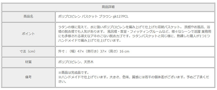 | 見た目は天然素材なのに汚れたら丸洗いできる、ポリプロピレン製の脱衣カゴ。 ポリプロピレンは水に強いため、汚れたら水やお湯で丸洗いできます。 籐家具職人がひとつひとつ丁寧に編み上げていしますので、しっかりとした丈夫なつくりです。 ポリプロピレン製の編み材を使用しているので、カビの発生、ささくれ、腐るといった天然素材特有のトラブルが発生することなく、安心して永くご使用いただけます。 天然素材のようなナチュラル感があり、見た目がオシャレ。 3色からお選びいただけます。 ※ 詳細画像をご確認ください。 ※ハンドメイドで仕上げている為、大きさ、重量には若干の個体差がございます。予めご了承ください。 | |