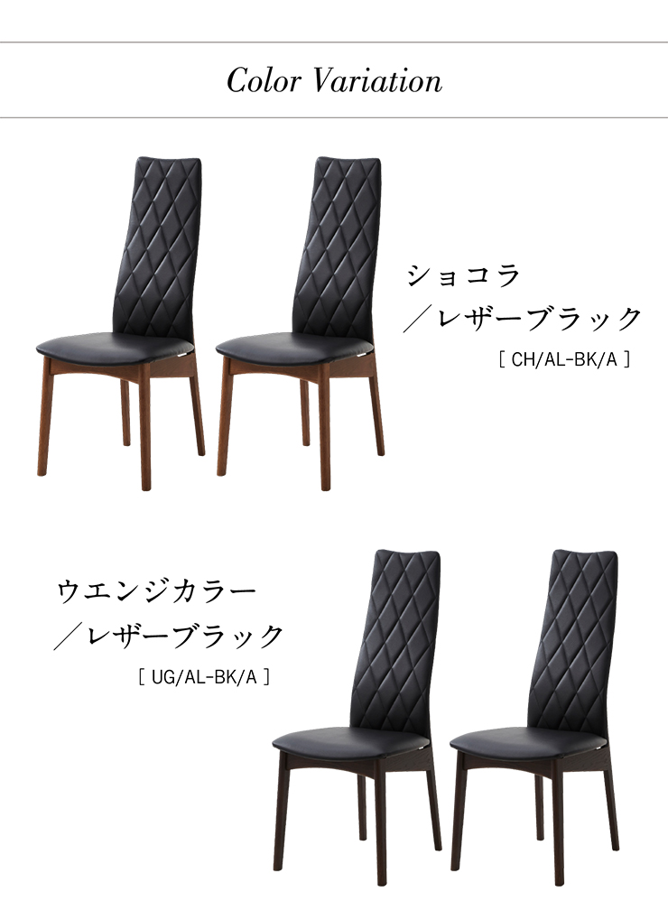 | 高級感あふれるデザインで一気にモダンなダイニングルームに スタイリッシュなフォルムとツートンカラーが印象的なダイニングチェア。重厚感あふれるPVC生地とキルティング加工が空間に品を与え、生活をさらに上質なものへと変化させます。美しく、優しく体を支えるハイバックチェアです。 ■Design / 重厚感あふれる 2color ・落ち着いたショコラカラー(CH/AL-BK/A) ・洗練されたウエンジカラー(UG/AL-BK/A) キルティング加工を施したハイバックデザイン 正面や背面どちらから見ても美しいキルティング加工。 背の高い背もたれが身体をしっかりと支えます。 背面にはグリップ(持ち手)の役割も果たす、補強が入っているので椅子の出し引きに便利です。 ■material / PVC×レッドオーク 座面・背もたれにはPVCレザーを使用しています。 水や汚れに強いPVC生地はお手入れラクラク。 程よいクッション性が快適な座り心地を実現しています。 脚部には強度に優れたレッドオーク材を使用 ウレタン塗装 & 低ホルムアルデヒド F★★★★ ※こちらは、チェア単品の販売となります。テーブル等は別売りとなります。 ※こちらの商品は、天然木を使用しております。その為、木の表情や風合いには個体差がございます。節など木の風合いを理由とした返品・交換は対象外となりますので予めご了承ください。 ※若干の個体差によって、表記サイズと完成形のサイズに多少の誤差が生じる場合がございます。予めご了承ください。 | |