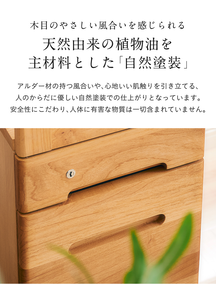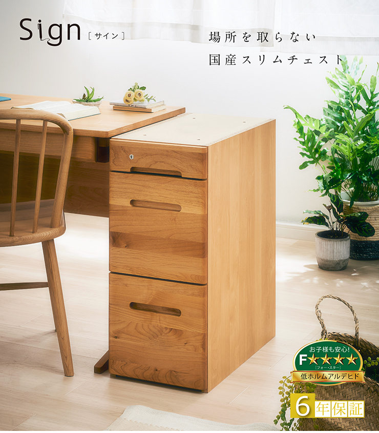 | 場所を取らないスリムラック Sign(サイン) 直線を基調としたシンプルなデザインながら、ぬくもりを感じるナチュラルテイストのラック 直線的なスッキリデザインが人気のシリーズ「Sign」から、使い方を2種類から選べるラック下台が登場。同シリーズのラック上台(別売り)と繋げてタワータイプとして使ったり、ラック下引出天板(別売り)と合わせてサイドチェストのように使ったり。お部屋やシーンに合わせてお好みのレイアウトをお楽しみいただけます。 ■子ども部屋に置くツインデスクの間仕切りとして デスクを横に並べても、タワータイプのラック上台が仕切りとして活躍してくれるので、より集中してお勉強することができます。 ■チェストの天板で、さらに広く!作業もしやすく、のびのびと使える チェストスタイルにした下台ラックを2つのデスクで挟めば、リビングに置いて子どもたちの学習を見守るのにピッタリ。兄弟・姉妹で仲良く使えるレイアウトです。 ■自然の温もり溢れる優しい素材 ・アルダー材 木質は比較的柔らかく、肌触りがよくて軽いのが特徴。優しい色合いと美しい木目が人気の木材です。 ・無垢材 合板とは違い、原木を製材・加工したものを無垢材といいます。木そのものの質感・風合いが感じられる自然素材です。 ■自然塗装&低ホルムアルデヒド F☆☆☆☆ 天然由来の植物油を主材料とした自然塗装を使用 。人体に有害な物質は一切含まれていません。 ■3つの嬉しい機能 ・カギ付き ・3段全てフルスライドレール仕様 ・仕切り板(1枚)付き ※ラック上台もしくはラック天板との連結が必要です。こちらの商品単体でお使いいただくことはできません。 ※若干の個体差によって、表記サイズと完成形のサイズに多少の誤差が生じる場合がございます。 ※こちらの商品は、天然木を使用しております。その為、木の表情や風合いには個体差がございます。節など木の風合いを理由とした返品・交換は対象外となります。 ※こちらは、ラック下台単品の商品ページとなります。デスク・チェア等は別売りとなります。 ※オイル塗装の特徴として、使用初期段階で衣服等に色移りする可能性がございます。ご使用前に表面を布等で軽く拭いてからご使用下さい。 ※お手入れは乾いた布で軽く拭いてお手入れをして下さい。(あまり強く拭きますと、キズの原因となりますのでご注意下さい) ※天然木を使用しておりますので、水拭き等はおやめ下さい。 ※シミの原因となる汚れ(お茶・コーヒー・しょうゆ等)が付いた場合は、放置せずすぐに拭き取って下さい。また、濡れたものを長時間放置しますと、同様にシミや変色の原因となります。 ※熱したものや汚れたものを直接置きますと、シミや変色の原因となりますのでご注意下さい。 | |