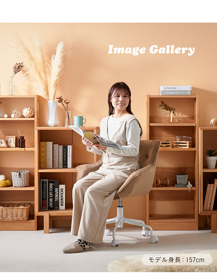 | 包み込まれるような座り心地のデスクチェア キャスター付きチェア Marte(マルテ) なめらかな触り心地のベロア調生地と、丸みのあるフォルムが魅力のキャスター付きチェアMarte。 お部屋に溶け込むナチュラルな2カラーをご用意。 ■便利な調節機能 ・ガス圧式昇降機能[ 座面高42〜50cm ] ・360°回転座面 ・キャスター付き ■Material ・なめらかな触り心地のベロア調生地 張地には、肌触りの良いベロア調生地を使用。ほどよい光沢感が上品な印象を与えます。中材には程よい弾力のあるウレタンフォームを採用。厚みのある座面で身体をしっかり支えます。 ・スチールで強度をアップした内部構造 ■function ・レバー操作でラクラク昇降 簡単なレバー操作で高さ調節が可能です。無段階昇降なので自分に合った最適な高さまで微調整ができます。 ・360度回転する座面 座りながら向きを変えることができるので立ち上がりやすく、椅子からの出入りが楽な360°回転式座面です。 ・スムーズに移動できるキャスター付き ■Situation シンプルなデザインだからいろんな場所で大活躍 ・家族のダイニングチェアとして 座面の高さが調節できるので、家族それぞれの身体に合った高さで食事を囲むことができますね。 ・お子さまの学習チェアとして 360°回転式座面で椅子からの出入りもラクラク。学習デスクのチェアとしてはもちろん、システムベッドのチェアとしても活躍します。 ■Detail ・ゆったり座れる広めの座面設計 座面サイズ:横幅37x奥行き46cm ・回転時や立ち上がり時をサポートしてくれる、程よい高さの肘置き ※こちらの商品はお客様組み立てとなります。 ※組み立て方や若干の個体差によって、表記サイズと完成形のサイズに多少の誤差が生じる場合がございます。 ※商品に糸の飛び出しなどが見られる場合は、お手数ではございますがハサミでカットしていただきますようお願いします。飛び出た糸をカットしたところからほつれることはございませんのでご安心ください。 ※背面のラインは、製造過程で発生する商品の仕様となっております。生地の着脱はできかねます。 ※座面の下降には約35kg程度の体重が必要です。 | |