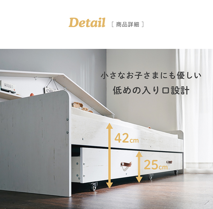 | ディスプレイを楽しめるハウス型宮棚付き 親子ベッド Syrup (シロップ) スライドベッドでお部屋広々 下段をキャスターがついたスライドベッドにした、収納たっぷりな親子ベッドをつくりました。ベッド1台分のスペースに設置できるので、限られたスペースを有効活用できます。 ■収納/ディスプレイ棚として使えるハウス型の宮棚 お家の屋根をモチーフにしたデザインが特徴的な宮棚は、ワイドな設計でたくさん収納できます。本やおもちゃなど好きなものを置いて、ベッドで過ごす時間をもっと快適に。 ■様々なシーンで便利な親子ベッド 使いたいときだけサッと出せるスライドベッドは、お友達が来たとき、お部屋を広く使いたいときなど様々なシーンに対応します。下段を収納スペースとして使ってもOK。ライフスタイルに合わせていろいろな使い方ができるのが、親子ベッドの特徴です。 ■安心・安全ストッパーキャスター 出し入れ楽々なスライドベッドのキャスターは、角の4ヵ所だけでなく中央の2ヵ所にもつけることで安全性を高めています。さらに手前3つのキャスターにはストッパーを付けました。お休み時はロックできるので安心ですね。 ■小さなお子さまにも優しい低めの入り口設計 ■通気性に優れたメッシュ床 親ベッド、子ベッドともに通気性に優れたメッシュ床を採用。メッシュボードは本体のフレームにしっかり固定するので安心です。 ※こちらの商品はお客様組み立てとなります。 ※組み立て方や若干の個体差によって、表記サイズと完成形のサイズに多少の誤差が生じる場合がございます。 ※こちらの商品はベッド本体のみの販売となります。マットレスや寝具、その他小物類は付属しておりません。 | |