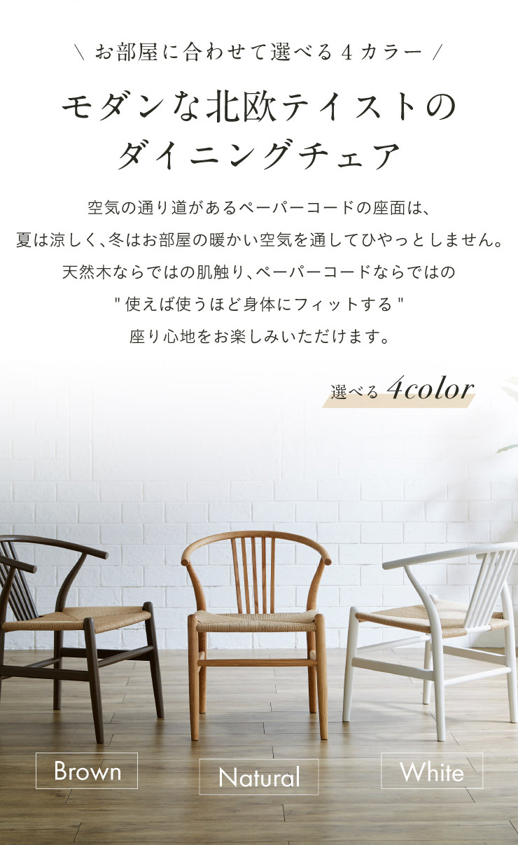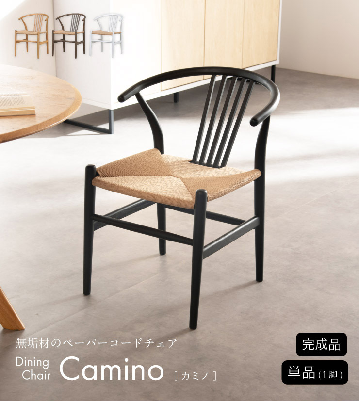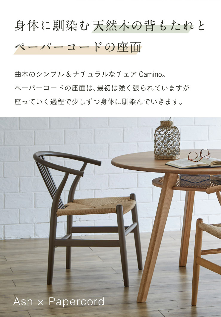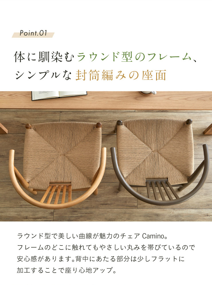 | 3カラーから選べる無垢材のペーパーコードチェア Dining chair Camino(カミノ) お部屋に合わせて3カラーから選べるモダンな北欧テイストのダイニングチェア 空気の通り道があるペーパーコードの座面は、夏は涼しく、冬はお部屋の暖かい空気を通してひやっとしません。天然木ならではの肌触り、ペーパーコードならではの"使えば使うほど身体にフィットする"座り心地をお楽しみいただけます。 ■身体に馴染む天然木の背もたれとペーパーコードの座面 曲木のシンプル&ナチュラルなチェアCamino。ペーパーコードの座面は、最初は強く張られていますが座っていく過程で少しずつ身体に馴染んでいきます。在宅ワークなどでダイニングで過ごす時間が長い方におすすめです。 ■素材について ・ペーパーコード ペーパーコードとは防水処理を施した紙紐のこと。太さが均一な素材なので、座面の見た目が美しく仕上がるのが特徴です。へたりにくく、使い込むほどに体に馴染んでいく過程をお楽しみいただけます。 ・アッシュ材 素朴であたたかみのある、落ち着いた木目の歴史のある木材。野球のバットなどスポーツ用品として使用されることからも、耐久性に優れ衝撃に強いことがわかります。 ■体に馴染むラウンド型のフレーム、シンプルな封筒編みの座面 ■ゆったりくつろげる背もたれと繋がるデザインの肘掛け ■座面の高さは男女ともに座りやすい42.5cm ■腰を深くかけられるゆったりサイズの座面 ※若干の個体差によって、表記サイズと完成形のサイズに多少の誤差が生じる場合がございます。予めご了承ください。 ※こちらの商品は、天然木を使用しております。その為、木の表情や風合いには個体差がございます。節など木の風合いを理由とした返品・交換は対象外となりますので予めご了承ください。 ※濡れたままのペーパーコードに座ると座面が伸びてしまう可能性があります。もし水気のものをこぼした場合は、やわらかい布乾いた布でこすらず、素早く拭き取り、完全に乾いてから座ってください。 ※摩擦などで、色落ちや色移りする場合がございます。ご注意ください。 ※職人がひとつひとつ手作業で編み上げておりますので、仕上がりには若干の個体差がございます。予めご了承ください。 | |