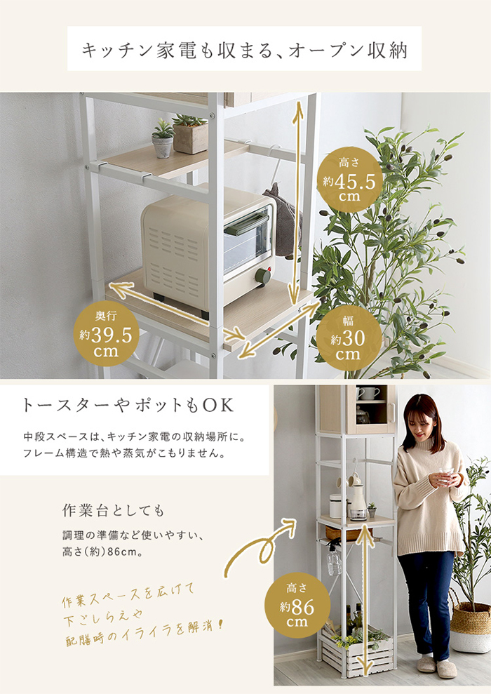 | さわやかなオシャレゴミ箱上ラック すきま収納タイプ34cm幅! あの隙間に収納ラックがあれば、、、というお客様におすすめの34cm幅のすきま収納ラックです。 無駄を省いたシンプルデザインで圧迫感を与えずスッキリと収納できます。 ホワイトアイアン×木目はお部屋をスッキリ魅せれます。 高さ調整できる可動棚なのでスペースを無駄なくお使い頂けます。 一般的な容量45Lゴミ箱が1個置くことができます。 最上段にはちょっとした物置としてもお使い頂けます。 ※こちらの商品はお客様組立となります。 ※詳細画像をご確認ください。 | |