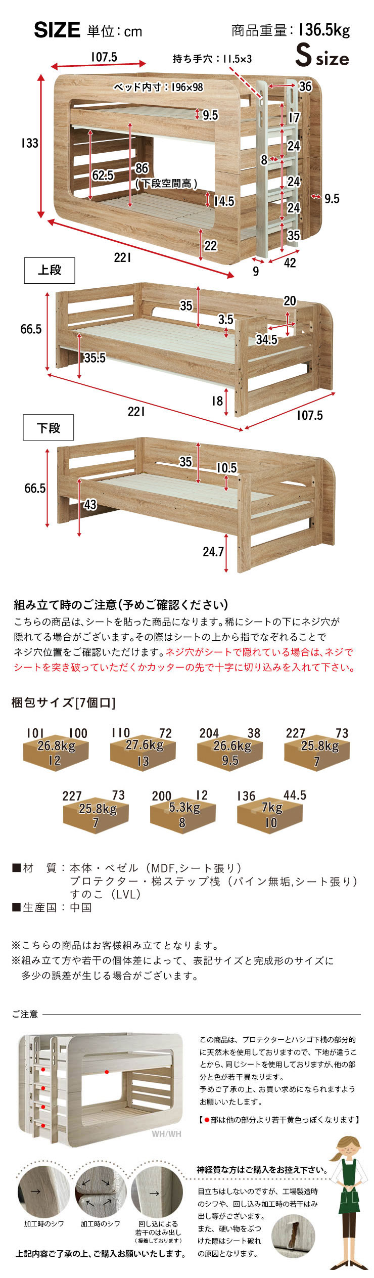 ママの想いがつまったぼくと、わたしのひみつ基地 Bunk Bed Fully(フーリー)Sサイズ ■Design フォトフレームのような、わくわくするデザイン べゼルと名付けられた特徴あるフレームを、自然のあたたかみあふれる木目のシートで仕上げたFully(フーリー)。フォトフレームの中に入っているかのような遊びゴコロあるデザインです。 ■Separate 分割できるから成長してからも買い替えの必要なし 上下を分割してシングルベッドのように使用が可能です。2台横に並べたり、別々のお部屋で使ったりと、お子さまが成長してからも長くお使いいただけるのでとっても経済的。 ■Safety 安心して寝かせられる、安心・安全設計 ・革新的新構造で地震対策を強化 ・特許取得のすのこ落下防止構造 ・静止耐荷重試験500kgをクリア ◯組み立て時のご注意(予めご確認ください) こちらの商品は、シートを貼った商品になります。稀にシートの下にネジ穴が隠れてる場合がございます。その際はシートの上から指でなぞれることでネジ穴位置をご確認いただけます。ネジ穴がシートで隠れている場合は、ネジでシートを突き破っていただくかカッターの先で十字に切り込みを入れてください。 ※こちらの商品はお客様組み立てとなります。 ※組み立て方や若干の個体差によって、表記サイズと完成形のサイズに多少の誤差が生じる場合がございます。 | |