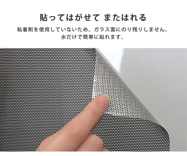 | 暑い日でもお部屋を涼しく! 遮熱・目隠しメッシュシート 90 x 180サイズ 2枚セット お部屋の遮熱と紫外線をカットでき、強い日差しの室内への侵入を防いでくれます。 夏の省エネ対策に役立ちます! ノリなどを使用しないので、何度も張り直し可能!取り外しもカンタンにできます。 ■暑い日々も涼しく快適に! 遮熱効果は約-7℃、UVカット率は82%。 強い日差しの室内への侵入を防ぎます。 ■プライバシー対策もばっちり 室内側はブラックで外の景色が見えますが、外側からはシルバーで部屋の中が見えにくい仕様になっています。 ■水だけで貼ってはがせる 粘着剤をしようしておりませんので、ガラス面にノリ残りしません。 水だけで簡単に貼れます。 ■カッターで簡単にカットできます! メッシュ状のシートになっていて、窓のサイズに合わせてカンタンにカットできます。 ※必ずサイズをよくご確認の上ご注文下さい。サイズ違い等での返品・交換は受け付けておりません。 | |