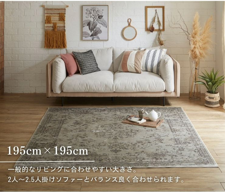 | モケットラグ 195 x 195cm モケット織でアンティークな雰囲気 やわらかくて触り心地が良く、独特の光沢。 毛足が短く、肌触りが良く、掃除機もかけやすい。 摩擦に強く、耐久性にも優れており、ラグの他に椅子やソファの張り地、バスや電車の座席などに使われています。 ※ホットカーペット・床暖房OK | |