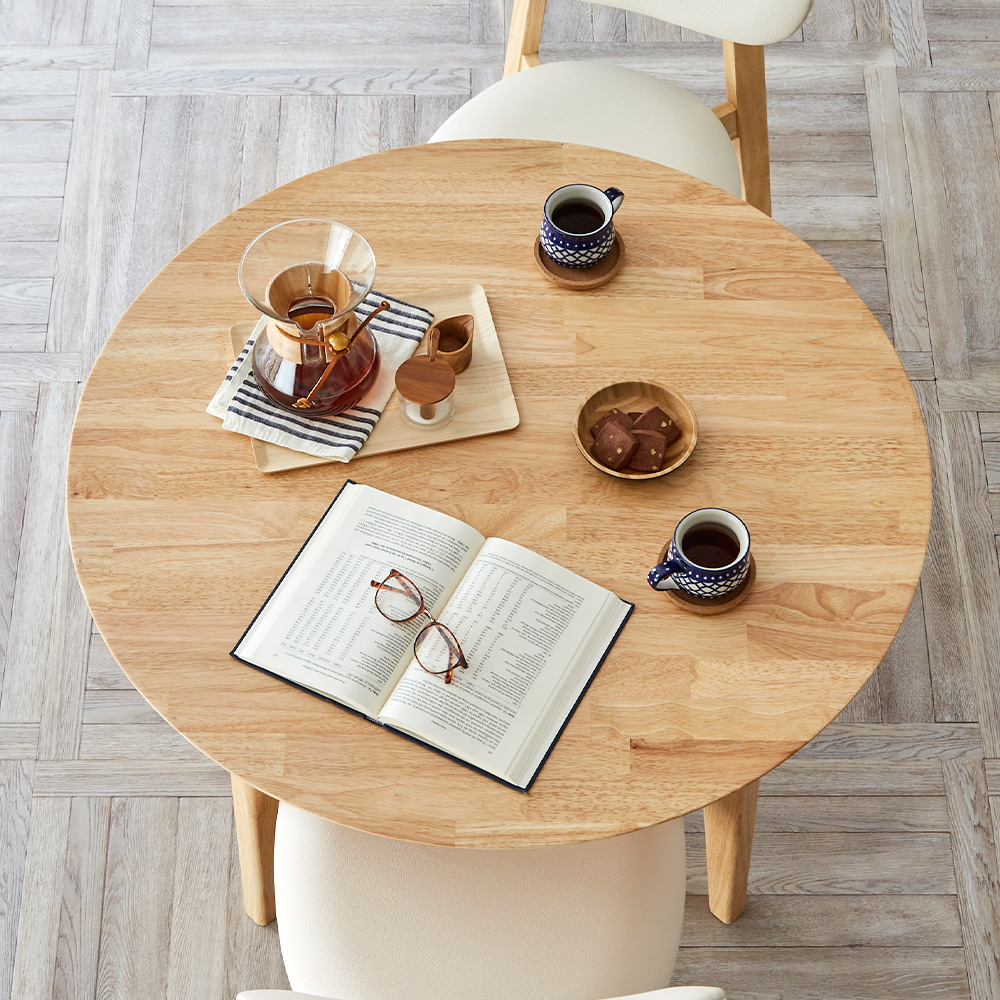 | 円形ダイニングテーブル Cocotte [ ココット ] テーブル単品90cm みんなが集まる、とっておきの憩いの場所 シンプルで使い勝手抜群のダイニングテーブル。90cmの円形タイプで、大人2人でゆったり使用するのにちょうど良いサイズ。明るいナチュラル色のあたたかみのあるテーブルで、ダイニングを憩いの空間へ。 ■Design お部屋を彩るカジュアルデザイン 丸みをおびたデザインと、ラバーウッドの質感があたたかみを与えるCocotte。シンプルなデザインなので、他のインテリアとの相性も◎。 ■Material やわらかい印象のラバーウッド なめらかな肌触り、やわらかい木目が特徴のラバーウッド。淡いナチュラル色のやさしい色合いが、お部屋にあたたかみを与えてくれます。 ■2人でゆったり使える90cmの円形タイプ 一般的に大人1人が快適に食事をするのに必要なスペースは、幅60cm×奥行き40cmと言われています。Cocotteの90cm円形テーブルは、大人2人が使うのにちょうど良い大きさ。一人暮らしのちょっとしたテーブルとしてもお使いいただけます。 ※こちらの商品はお客様組み立てとなります。 ※組み立て方や若干の個体差によって、表記サイズと完成形のサイズに多少の誤差が生じる場合がございます。 ※こちらの商品は、天然木を使用しております。その為、木の表情や風合いには個体差がございます。節など木の風合いを理由とした返品・交換は対象外となります。 ※熱いものを置くときは、直接置かないように注意してください。 ※防水ではございませんので、濡れた場合は放置せずすぐに拭き取ってください。 ※こちらはテーブル単品のページです。チェアは別売りとなります。 | |