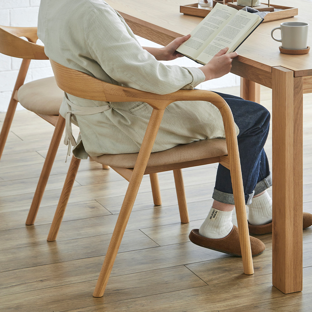 | 美しい曲線が際立つシンプルなフォルム Dining chair Plato(プラト) ファブリック・PVC なめらかな曲線がフィットする北欧テイストのダイニングチェア。 丸いフォルムが特徴のダイニングチェアPlatoにファブリック・PVC座面が登場。落ち着いた木目を持つアッシュ材との組み合わせが上品な印象を与えます。 ■革のような風合いのファブリック生地 張地には、ファブリック生地を使用しました。色ムラやシワ模様を再現した、まるで革のような質感。PVCに比べて、生地が柔らかく通気性があるのが特徴です。 ■上品な質感の「PVC生地」 インテリアに上品さをプラスしてくれる、なめらかで張りのある質感のPVC生地。汚れてもサッと拭くことができるのも魅力です。 ■緩やかな曲線を描いた背もたれと繋がるデザインの肘掛け 背もたれのアーチと肘掛けが一体化したデザインで、お部屋がすっきりとした印象に。肘を置いてリラックスしたり、立ち上がる際の手すりとして使ったりと、機能性に優れています。 ■腰を深くかけられるゆったりサイズの座面設計 奥行き・幅がしっかり確保されているので、男女問わず余裕を持ってお座りいただけます。 ■落ち着いた木目の[アッシュ無垢材]を使用 フレーム部分にはアッシュ無垢材を使用しています。頑丈で変形しにくく、経年変化が少ないのが特徴です。 汚れに強いウレタン塗装を施しています。 ※こちらは、チェア単品の販売となります。 ※若干の個体差によって、表記サイズと完成形のサイズに多少の誤差が生じる場合がございます。 ※こちらの商品は、天然木を使用しております。その為、木の表情や風合いには個体差がございます。節など木の風合いを理由とした返品・交換は対象外となります。 ※職人がひとつひとつ手作業で制作しております。フレームの丸みなどの加工には若干の個体差がございます。 | |