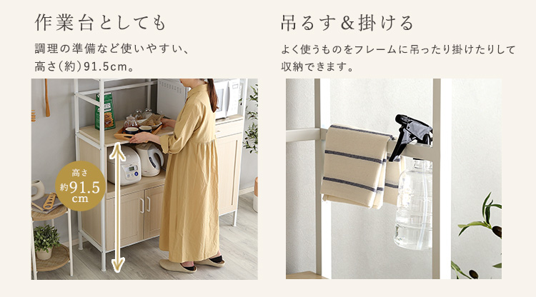 | さわやかなオシャレワイド食器棚 Frais(フレ) 3人、4人家族におすすめの収納場所に困らない120cm幅の大容量ワイドタイプ。上段はガラス扉収納なので食器を簡単に見つけられます。 キッチン家電や調理器具も丸ごと収納できるので、キッチン周りもスッキリ。 スライドトレー付近には2口コンセントがついているので、炊飯器などを置くのにピッタリです。 ■パッと見つかるガラス扉と高さ調節できる可動棚 上段には、丈夫で安心な強化ガラス扉を採用。取っ手の付いた両開きなので、大小さまざまな食器の出し入れがしやすく、すぐ使うものや見せたいものの収納におすすめです。 棚の高さが調節できる「可動棚」はダボ穴は6段あり、収納したいものに合わせることがてきるので、スペースを無駄にしません。 ■キッチン家電も収まる、オープン収納 中段スペースは、キッチン家電の収納場所にフレーム構造で熱や蒸気がこもりません。レンジやトースターもOK背板の通気穴で、炊飯器や湯沸かしポットの熱や蒸気を逃がします。 ■水濡れに強い フレーム・木目部分ともに、さっと拭くだけでお手入れが簡単。水などがついてもしみこまないため、見た目の美しさを保つことができます。 ※お客様組み立て商品です。 | |