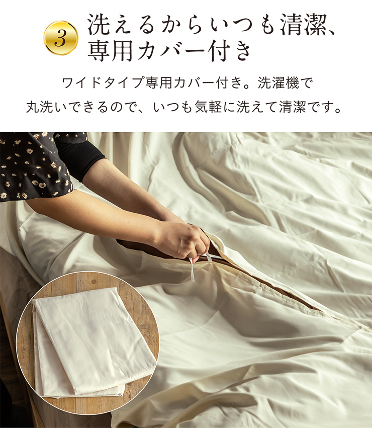 | 家族みんなで眠れるワイド掛布団洗えるカバー付 3人用 宮崎県にある工場で丁寧に仕立てたこだわりの掛布団 ■幅280cmのファミリータイプ 家族で使えるワイドサイズの掛布団です。幅が280cmあるので3人でゆったり。快適にお使い頂けます。 ■清潔で快適な高機能中綿を使用 中綿は、抗菌防臭、防ダニの効果のある東洋紡フィルハーモニイ®を使用しています。 ・抗菌防臭 菌の繁殖抑制率が通常のボリエステルの約99.5%。不快なニオイを抑制して快適な寝心地です。 ・防ダニ ダニの発生を阻害するので、ダニの抑制率は通常のポリエステルの約99.5%。ダニアレルギーの方にも安心してお使い頂けます。 ■洗えるからいつも清潔、専用カバー付き ワイドタイプ専用カバー付き。洗濯機で丸洗いできるので、いつも気軽に洗えて清潔です。 ■ 安心の日本製。ひとつひとつ職人さんの手作り 昭和52年創業、宮崎の工場で熟練の職人さんたちの手により、細かい部分も丁寧に作られた羽毛布団です。 ※カバーは中国製になります。 ※掲載写真は表記サイズと異なる場合がございます。 ※画面上のカラーはご使用ブラウザやモニターの設定により、実物とは若干異なる場合がございます。 ※こちらは「掛布団」単品の商品ページとなります。 | |