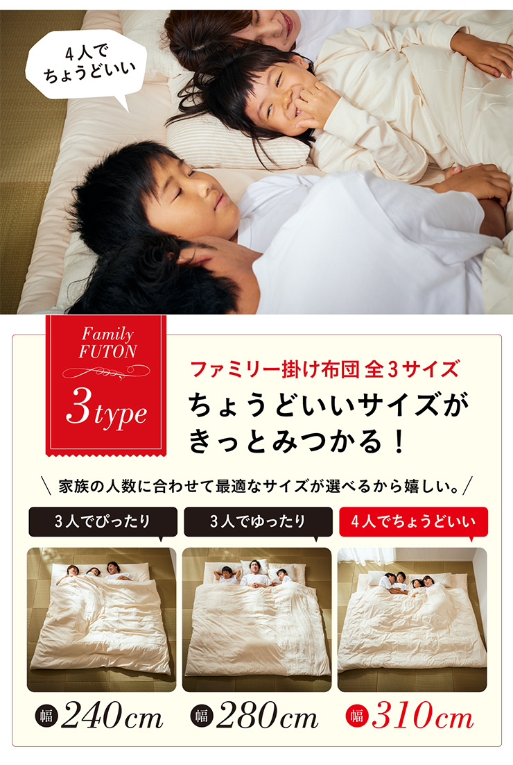 | 家族みんなで眠れるワイド掛布団洗えるカバー付 3人用 宮崎県にある工場で丁寧に仕立てたこだわりの掛布団 ■幅240cmのファミリータイプ 家族で使えるワイドサイズの掛布団です。幅が240cmあるので3人でゆったり。快適にお使い頂けます。 ■清潔で快適な高機能中綿を使用 中綿は、抗菌防臭、防ダニの効果のある東洋紡フィルハーモニイ®を使用しています。 ・抗菌防臭 菌の繁殖抑制率が通常のボリエステルの約99.5%。不快なニオイを抑制して快適な寝心地です。 ・防ダニ ダニの発生を阻害するので、ダニの抑制率は通常のポリエステルの約99.5%。ダニアレルギーの方にも安心してお使い頂けます。 ■洗えるからいつも清潔、専用カバー付き ワイドタイプ専用カバー付き。洗濯機で丸洗いできるので、いつも気軽に洗えて清潔です。 ■ 安心の日本製。ひとつひとつ職人さんの手作り 昭和52年創業、宮崎の工場で熟練の職人さんたちの手により、細かい部分も丁寧に作られた羽毛布団です。 ※カバーは中国製になります。 ※掲載写真は表記サイズと異なる場合がございます。 ※画面上のカラーはご使用ブラウザやモニターの設定により、実物とは若干異なる場合がございます。 ※こちらは「掛布団」単品の商品ページとなります。 | |