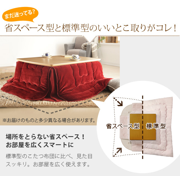 | はっ水リバーシブル 省スペースこたつ布団 Molf(モルフ) 170 x 170cm ふんわり優しい毛布みたいで、もこもこに包まれる幸せ。ふわもこぜいたくな冬ごもりができるこたつ布団です。省スペースなのに期待以上のボリューム感で、質感・高級感に大満足できます。かさばらず、可愛く、暖かく、撥水加工で汚れにくいので、小さなお子様のいるご家庭にもオススメです。フランネルとフリースのリバーシブルになっており、好みや雰囲気に合わせて楽しむことができます。 ■ふわふわ柔らかいフランネル&フリース。コーナーまで中綿入りふっくら暖か! 省スペースこたつ布団の代表的な生地といえばフリース。そのフリースと比べ、フランネルは細い毛足と、生地自体の肉厚さが特徴。保温性にすぐれ、さわリ心地もやわらかくなめらかです。中綿入リで暖かさも更にUP!コーナー部分は表裏2枚のフリースの間に中綿を入れ、保温力をさらにアップさせました!他の商品にはない特徴です。 ■はっ水加工でずっとキレイなこたつ布団! 表地ははっ水加工がされており、汚れが染み込みにくい素材です。もう、うっかり食べこぼしも怖くない!洗濯機で丸洗いできるから、いつでも清潔にお使いいただけます。小さなお子さんのいるご家庭にぴったり。 ■省スペース型と標準型のいいとこ取り!天板面も同素材でスマート 標準型のこたつ布団に比べ、スッキリ。お部屋を広く使えます。天板の重なる部分も、標準型のこたつ布団のように、同素材の生地で作られているから、こたつの天板が少々ずれても見た目はスマート。角丸の天板や、カーブのついた天板にもおすすめです。※お届けのものと多少異なる場合があリます。 ※こちらはこたつ布団のみの販売となります。こたつ本体は付属しておりません。 | |