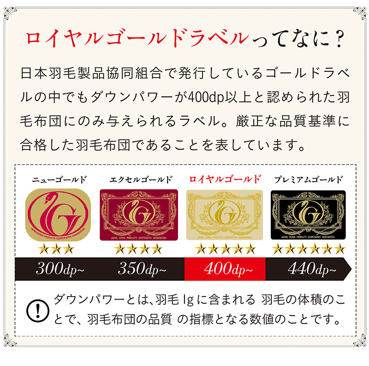 | 5つ星ロイヤルゴールドラベル取得 宮崎県にある工場で丁寧に仕立てたこだわりの羽毛布団 ■ゴールドラベルは、良質な日本製の羽毛布団である「安心の証」です 日本羽毛製品協同組合の品質基準に合格した、最高級の羽毛原料と優良な側生地を使用し、適正な縫製で仕上げられた羽毛ふとんのみに発行されるものです。 ■国内トリプル洗浄で清潔・安心 九州の豊かな水源を使用して、羽毛の細かな汚れを丁寧にクレンジング。さらに除菌&防カビのオゾン加工で、気になるニオイカットして、洗い立ての羽毛だけを詰め込みました。 ■ふわふわ柔らかホワイトダックダウン93% 空気をたっぷり含んで膨らむので、ふわふわ柔らか。寝汗などの湿気を布団の外に発散し、蒸れにくく 、さらりと快適な睡眠環境を作ります。 ■羽毛の吹き出しを防ぐ「ダウンプルーフ加工」 長く安心して使って欲しい...羽毛の飛び出しを軽減するために細部にまでこだわりました。 ■ふっくら羽毛を取り戻すパワーアップ加工 専用の機械にかけることで、本来のふんわり感を取り戻すことができます。 ■あたたかさを閉じ込める移動防止立体キルト構造 通常の立体キルトには無い特殊な弁を使用しているため、羽毛が隣のマスに移動せず、片寄りにくい布団になりました。 ■軽くて肌触りなめらか「ピーチスキン加工」 薄起毛といわれるごく軽い起毛を施し、 桃の肌のような柔らかな風合いに仕上げるピーチスキン加工。 なめらかな肌触りをお楽しみ下さい。 ■安心の日本製。ひとつひとつ職人さんの手作り 昭和52年創業、宮崎の工場で熟練の職人さんたちの手により、細かい部分も丁寧に作られた羽毛布団です。 ※掲載写真は表記サイズと異なる場合がございます。 ※画面上のカラーはご使用ブラウザやモニターの設定により、実物とは若干異なる場合がございます。 ※こちらは「羽毛布団」単品の商品ページとなります。 | |
