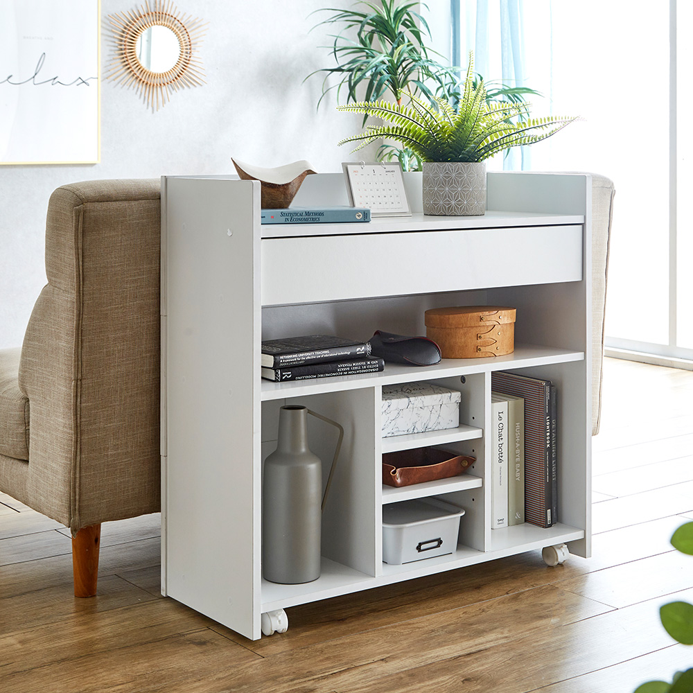 | 引き出し付き 隠せる収納 Azure(アズール) 裏返して、動かして、自由に使える便利なキャスター付き。使いたい時にさっと動かせ、来客時はくるっと裏返すだけでお部屋がすっきりと綺麗に見えるので、整理整頓されてなくても問題なし。お部屋の印象がガラりと変わる便利なリバーシブルタイプ。お片付けや整理整頓が苦手な方にもおすすめのアイテムです。 ■手を伸ばせる距離に置ける。動かせるからお掃除もしやすい。 必要な時は収納ごと近くに移動させることができるので、わざわざ取りに行かずにお使いいただけます。そばに置くことで片付けもとっても楽々。下にホコリが溜まって気になる・・・そんなよくある悩みもキャスター付きで解決。簡単に移動できるので、普段のお掃除も楽に行えます。 ■場所を選ばないコンパクトサイズ 幅79x奥行引x高さ80cmのコンパクトサイズ。壁につけて置くのはもちろん、カウンター下やソファ裏などちょっと空いたスペースに置くことができます。 ■広々とした天板に大きな引き出し1杯と可動棚収納 散らかりがちな文房具や小物類をまとめて収納できます。引き出し下は幅のあるものも収まるワイドスペース。引き出しに入らないものもこちらに収納できます。下段中央は置きたいものに高さを合わせることができる可動棚収納。 ※こちらの商品はお客様組み立てとなります。 ※組み立て方や若干の個体差によって、表記サイズと完成形のサイズに多少の誤差が生じる場合がございます。予めご了承ください。 | |