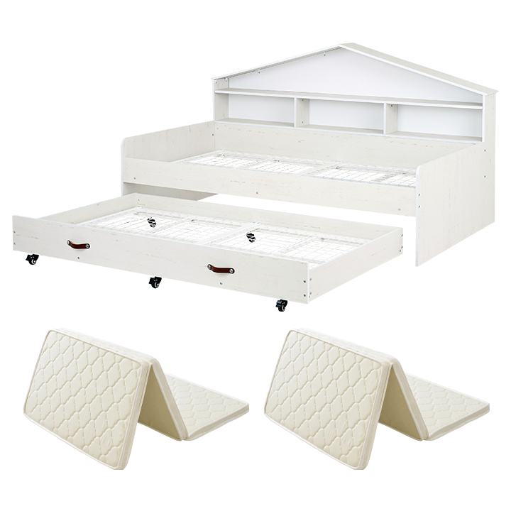 | ディスプレイを楽しめるハウス型宮棚付き 親子ベッド Syrup (シロップ) スライドベッドでお部屋広々 下段をキャスターがついたスライドベッドにした、収納たっぷりな親子ベッドをつくりました。ベッド1台分のスペースに設置できるので、限られたスペースを有効活用できます。 ■収納/ディスプレイ棚として使えるハウス型の宮棚 お家の屋根をモチーフにしたデザインが特徴的な宮棚は、ワイドな設計でたくさん収納できます。本やおもちゃなど好きなものを置いて、ベッドで過ごす時間をもっと快適に。 ■様々なシーンで便利な親子ベッド 使いたいときだけサッと出せるスライドベッドは、お友達が来たとき、お部屋を広く使いたいときなど様々なシーンに対応します。下段を収納スペースとして使ってもOK。ライフスタイルに合わせていろいろな使い方ができるのが、親子ベッドの特徴です。 ■安心・安全ストッパーキャスター 出し入れ楽々なスライドベッドのキャスターは、角の4ヵ所だけでなく中央の2ヵ所にもつけることで安全性を高めています。さらに手前3つのキャスターにはストッパーを付けました。お休み時はロックできるので安心ですね。 ■小さなお子さまにも優しい低めの入り口設計 ■通気性に優れたメッシュ床 親ベッド、子ベッドともに通気性に優れたメッシュ床を採用。メッシュボードは本体のフレームにしっかり固定するので安心です。 ※こちらの商品はお客様組み立てとなります。 ※組み立て方や若干の個体差によって、表記サイズと完成形のサイズに多少の誤差が生じる場合がございます。 | |
