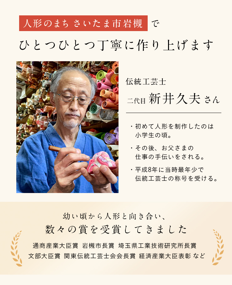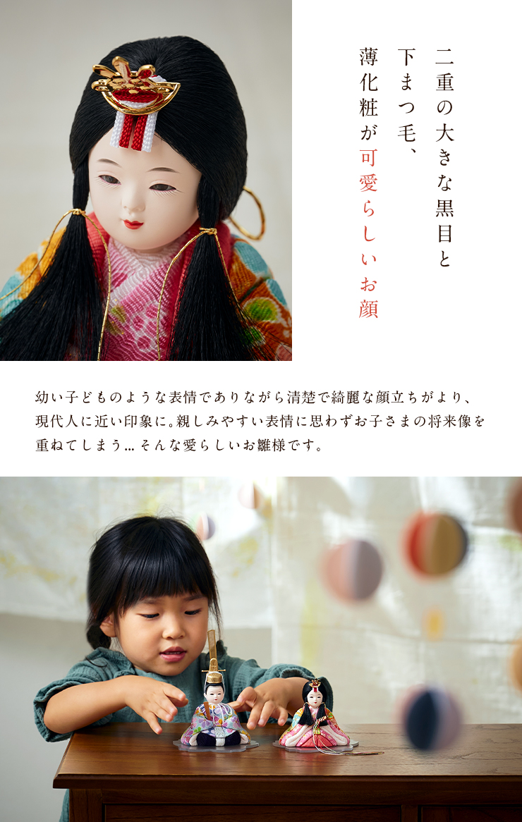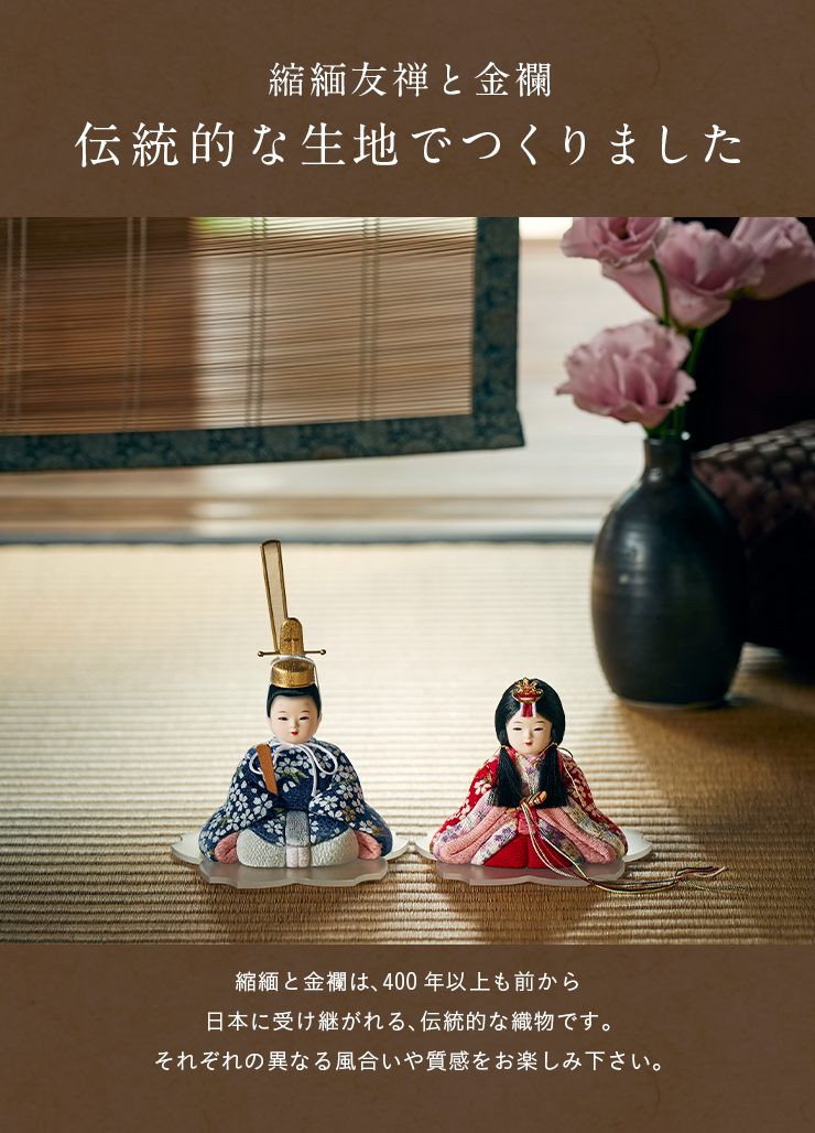 | 材質 | 衣装:ポリエステル、レーヨン 頭(お顔):石膏、胡粉(ごふん)塗り 台座:アクリル |