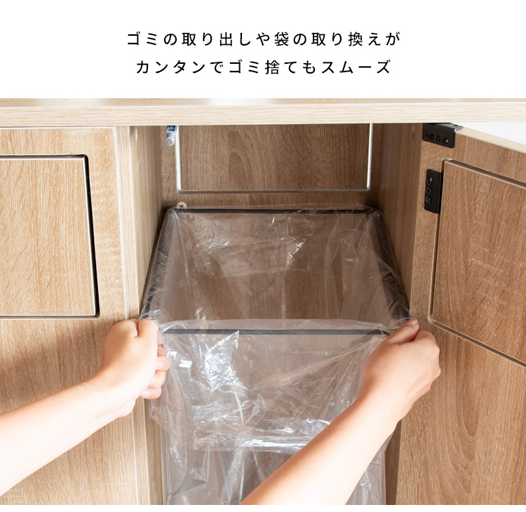 | カウンターダストボックス Harmoa(ハルモア) 幅90cm 二連のゴミ箱に収納棚がついたカウンターダストボックス『Harmoa(ハルモア)』。キッチン・ダイニングの両側にプッシュ扉があり、両方からゴミを分別して捨てられます。リビングやキッチンとの間仕切りとしても便利です。 ■キッチンでの作業を妨げず、反対側からゴミが捨てられる両側プッシュ扉 片手が塞がっていても扉を押すだけでゴミがカンタンに捨てられるプッシュ式扉は両側に扉があり、キッチン作業を邪魔せずダイニング側からゴミが捨てられます。 ■大容量45Lタイプの分別できる二連式ダストボックス 分別が必要なゴミが多く出るキッチンに最適なニ連タイプ。ペットボトルや缶・ビン、生ゴミなどを分けて捨てられます。45LX2の大容量でご家族の多いご家庭でも安心してお使いいただけます。 ■料理などの作業スペースとして使える幅90cmの天板 広々とした天板スペースで、お料理も快適に行えます。両側から使えるのでキッチン作業の補助や盛り付けにもピッタリ。 ■キッチンでも安心して使える水や傷に強い素材とこだわり設計 木板の素材は水や傷に強いPVC貼りの合板。汚れたり濡れてもサッとひと拭きでキレイになるのでキッチンに最適です。 | |