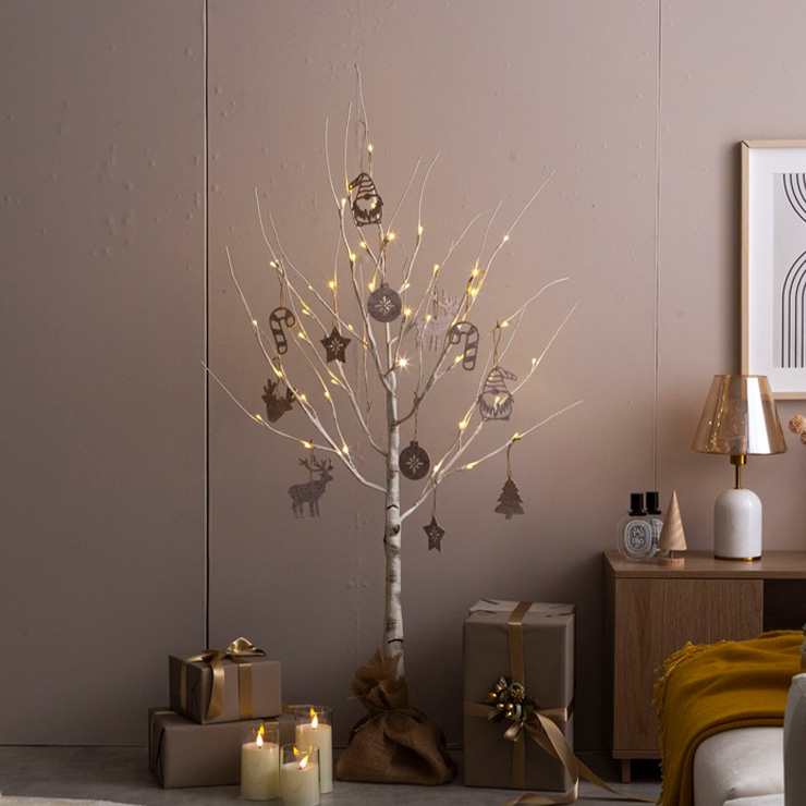 | LEDライト付き 白樺風ツリー オーナメントセット Schnee(シュネー) 高さ120cm 華奢で繊細な枝先に灯るLEDの優しい光とナチュラルな白樺の風合いが魅力的な『Schnee(シュネー)』のブランチツリーと、かわいいフェルトのオーナメントセット。まるで本物の白樺のような美しい木目と凹凸のある質感をリアルに再現しました。シンプルで上品な印象のツリーはワンランク上の落ち着いた大人な空間を演出してくれます。セットのフェルトオーナメントを一緒に飾れば、北欧のクリスマスのような雰囲気をお部屋に醸し出します。 ■癒しの空間を作る、優しく温かく灯るLEDライト 枝先にはふんわり優しく灯るLEDを使用。小さな光の粒が、落ち着いた温かみのある空間を演出してくれます。ウォームホワイトLED(点灯)とフラッシュLED(点滅)の2種類の光が織りなす、美しい空間で贅沢な時間をお過ごしください。 ■すっきり見せる専用脚カバー付き ツリーの足元を隠す、専用の脚カバーが付属。麻のべージュカラーが足元をすっきり見せて、さらに見栄えを良くします。 ■枝を調整して好きなニュアンスを楽しめる 形を簡単に調整できるツリーはあなた好みのフォルムに仕上げることが可能。スリムな形状からワイドな形状までカタチを変えることで、ツリーの表情を変化させることができます。お部屋の広さやシーズンに合わせて雰囲気を変えて、様々な形をお楽しみください。ツリーの設置場所の移動も気軽に行えます。ツリーは軽量設計なので、女性や子供でも簡単に持ち上げることが可能。 ■豊富な種類の北欧風オーナメントがセットに付属 北欧風で可愛らしいデザインの『Taⅳi(タルヴィ)』フェルト製オーナメントが7種類14個付属。壁に飾ったり、ツリーに飾れば、あたたかみ溢れるやさしい雰囲気のをお部屋に演出します。 ■やさしい手触りのフェルト素材 おうちでゆっくり楽しむ北欧クリスマスにぴったりなフェルト素材を選びました。ーつーつ仕上がりが異なり、味わいのある仕上がりです。また、軽くて柔らかい素材なので、万が一落ちても危険はなく、安心してお子様と一緒に飾り付けができます。 ※こちらの商品はお客様組み立てとなります。 ※組み立て方や若干の個体差によって、表記サイズと完成形のサイズに多少の誤差が生じる場合がございます。 | |