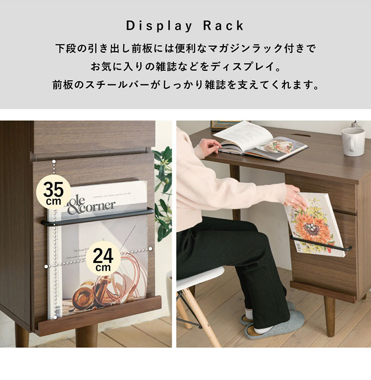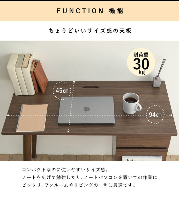 | 北欧シンプルデスク Runt 幅94cm 美しく味わいのある素材感と木目が魅力的な天然木脚デスク。長く愛用できるスマートで高級感のあるデザインです。 ■ちょうどいいサイズ感の天板 コンパクトなのに使いやすいサイズ感。ノートを広げて勉強したり、ノートパソコンを置いての作業にピッタリ。ワンルームやリビングの一角に最適です。 ■2サイズの引き出し収納 上段は浅型の引き出しで書類や小物の整理に最適。A4用紙がピッタリ入ります。開閉スムーズなコロレールを採用。下段は深型の引き出しで、A4ファイルも縦に収納できます。フルスライドレールで奥まで引き出せるので便利。 ■配線スムーズなコードスリット 天板には便利なコードスリット付き。デスクライトなどの配線を通すことができるので、デスクは壁にぴったり付けて設置できます。 | |