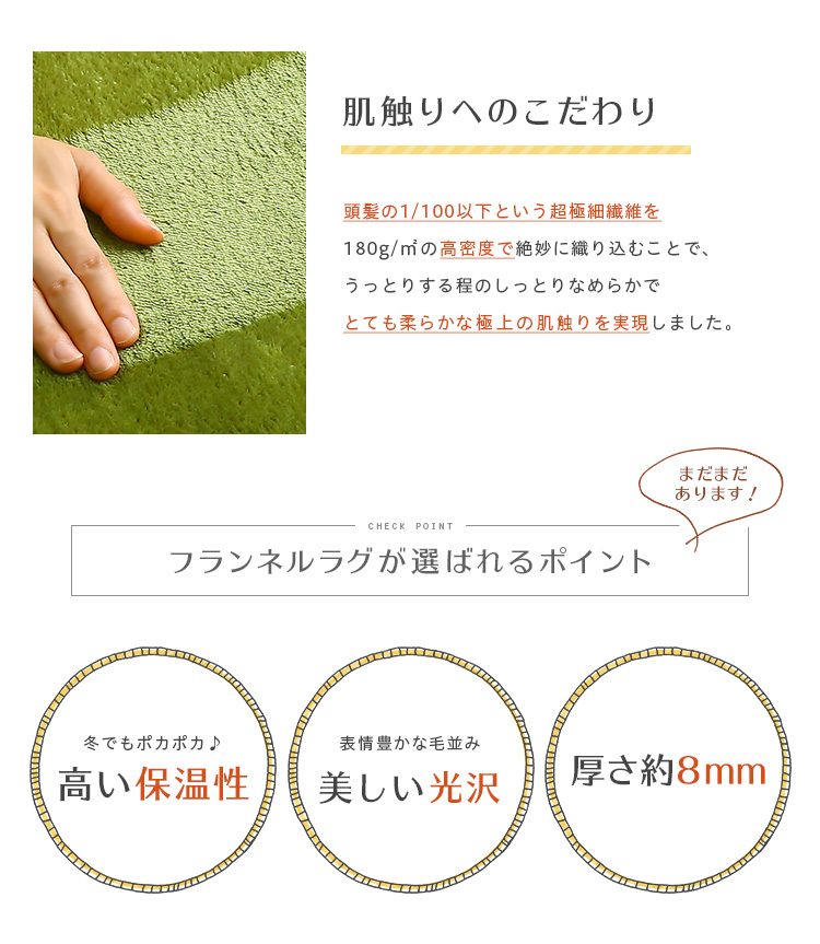 | 高密度フランネルマイクロファイバー・ラグマット Naltorea(ナルトレア) Mサイズ 185×185cm ふんわり幸せに包まれる極上の肌触りで、気づけば触れているやみつきフランネルラグマットです。オールシーズン対応で冬は暖かさをキープ。速乾性にも優れているので夏でもさらりとした肌さわりをお楽しみいただけます。 ■高密度フランネルマイクロファイバー 頭髪の1/100以下という超極細繊維を高密度で絶妙に織り込むことで、うっとりする程のしっとりなめらかでとても柔らかな極上の肌触りを実現しました。 ■お手入れ簡単&洗濯機で丸洗いOK 毛足が短いので、毛同士が絡まってゴワゴワしてしまったり、ホコリや髪、ペットの毛などのゴミが絡まって掃除がしにくくなることがなく、お手入れが簡単!掃除機をかけてもズレにくいすべり止め付き。ネットに入れて洗濯機で丸洗いすることができるので、毎日に肌に独れるラグをいつでも清潔にキープできます。※お洗濯の際は、必ずネットに入れて弱めのコースでお洗いください。 ■ノンホルムアルデヒド製品 熱で生地を圧着する接着剤を一切使用しない独自の特殊製法を採用しています。接着剤が原因で起こる変質やニオイの心配がないので小さなお子様やアレルギー体質の方でもあんしんしてお使いいただけます。 | |