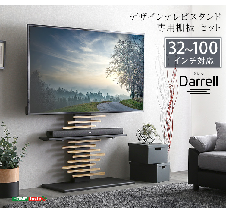 | デザインテレビスタンド 専用サウンドバー棚板 セット Darrell(ダレル) お部屋を広々、ゆったりとくつろげる空間に。デザイン性と省スペ-スを兼ね備えたテレビスタンドです。飾り板は自分スタイルにレイアウトでき、お部屋の空間をモダンに演出します。 ■場所を取らない省スペース設計 スペースを取るテレビ台が不要。壁面に穴をあけずに設置できるので、賃貸にも最適です。手軽に今のお部屋に大型テレビを取り入れられます。 ■配線や電源タップを背面に収納 配線は支柱に隠せるのでテレビ周りもスッキリします。 ※HDDホルダー付属 ■5段階高さ調整可能 高さは4cmピッチで5段階に調節可能。部屋のレイアウトや用途に合わせて細かく調整することができます。 ※テレビの構造やブラケットの取り付け位置によってブラケットがテレビの上部から見える場合がございます。 ■対応テレビサイズ(32~100インチ) シンプルなフォルムはテレビのサイズに左右されず、お部屋のイメージにも影響しません。 ※テレビによっては、取り付けできない機種もございます。ご購入前にご使用するテレビの仕様確認をおねがいします。 ■”揺れ”に強い「安心設計」 耐震試験にクリアし、震度7の耐震実験では、完全に倒れることなく元の位置を維持。安定感のあるベースで最大荷重65kgの大画面テレビをしっかりと支えます。 ■高さ調節可能の専用棚板 ブルーレイレコーダー、ゲーム機などを設置できる専用棚板は3段階に高さ調節可能。耐荷重は約10kgでしっかりとした安定感です。 | |