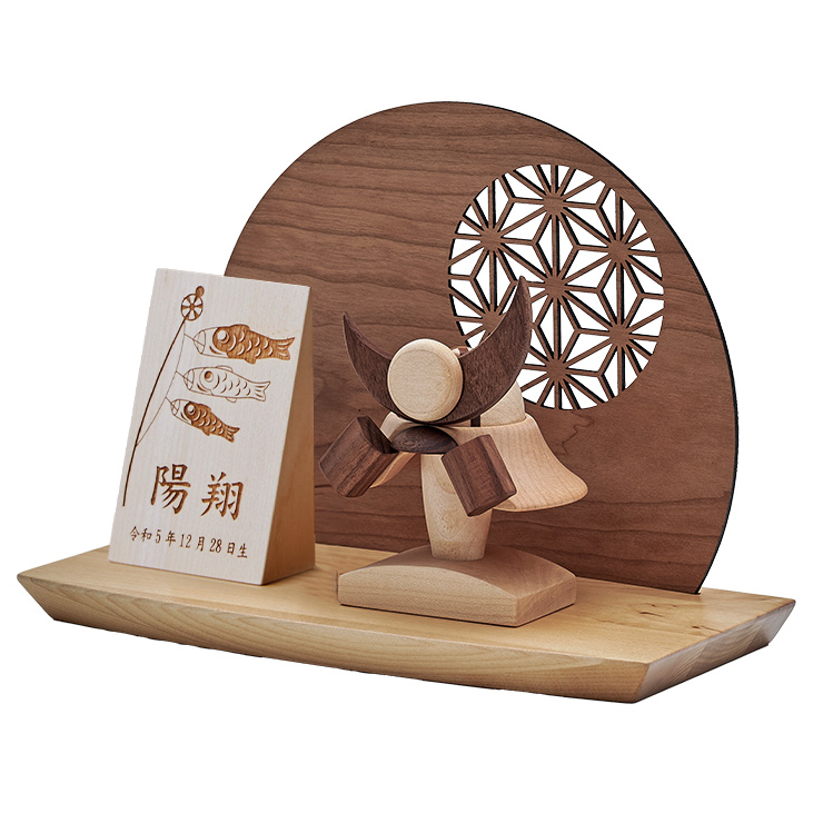 | ■職人さんの手仕事から生まれた、コンパクトでモダンな五月人形 ■シンプルでモダンなデザインが、和室にも洋室にも馴染みます。 ■メイプル×ウォールナット色味の異なる2種類の無垢材を組み合わせ ■木にも環境にも優しい塗料を使っています ■着脱パーツで簡単に組み立てられます ■日本の伝統柄『麻の葉』づかいで、節句がより華やかに ■オリジナル名前札で節句がより華やかに 《本作品に関するお願い》 本作品は、すべて職人による手加工にて製作を行っております。そのため、左右や厚みなど、寸法に数ミリ程度の個体差があります。また磁石につきましては、個体差に合わせて取り付けるため、本体中心より若干ずれている場合や、左右が対称でない場合もあります。あらかじめご理解いただきますよう、お願い申し上げます。 《注意事項》 ・カビ、または木の変形、変色が早まる恐れがあるため、使用時、保管時ともに、高温多湿、直射日光を避けてご愛用ください。 ・先端がとがっている部品がありますので注意しご使用ください。 ・本商品は食べ物ではありません。口の中には絶対に入れないでください。 ・小さなお子様が手を触れない場所にお飾りください。 ・平らな安定した場所にお飾りください。 ・ギフトラッピング&熨斗には対応していませんのでご了承ください。 | |