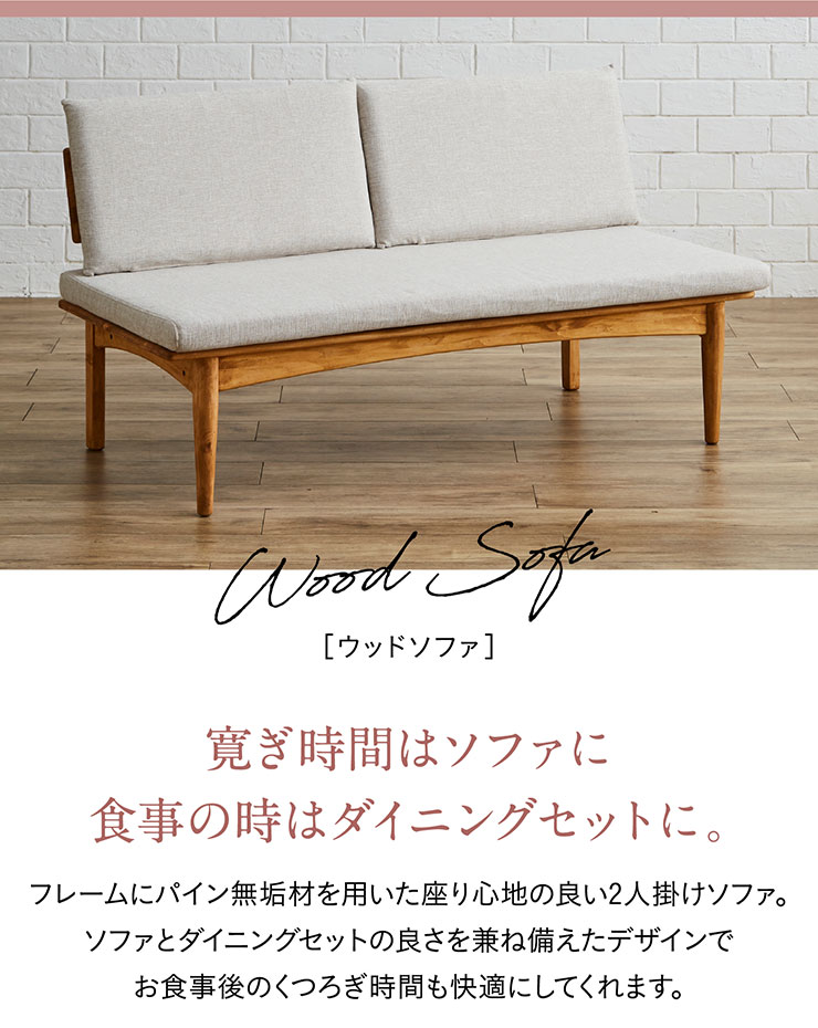 | ダイニング4点セット Atelier(アトリエ) 幅120cm 使うほどに味わおが増すパイン無垢材を使用したアトリエシリーズのリビングダイニングセット。 食事はもちろんのこと寛ぎ時間も快適に過ごせます。 ■ダイニングテーブル パイン無垢材ならではの温かみを引き出すシンプルなデザインでどんな空間にも合わせやすいダイニングテーブルです。 滑らかな丸みのあるフォルムは小さなお子様がいるご家庭でも安心してお使いいただけます。 ■ウッドソファ フレームにパイン無垢材を用いた諏訪居心地の良い2人掛けソファ。ソファとダイニングセットの良さを兼ね備えたデザインでお食事後のくつろぎ時間も快適にしてくれます。 ■アームレストパーツ ウッドソファを2台直角に設置し、片側にアームレストパーツをつけることでレストランのようなコーナーが作れます。 ※こちらの商品はお客様組み立てとなります 。 ※こちらはダイニング4点セットの販売ページです。 ※ こちらの商品は、天然木を使用しております。その為、木の表情や風合いには個体差がございます。節など木の風合いを理由とした返品・交換は対象外となります。 ※組み立て方や若干の個体差によって、表記サイズと完成形のサイズに多少の誤差が生じる場合がございます。 ※防水ではございませんので、濡れた場合は放置せずすぐに拭き取ってください 。 ※熱いものを置く時は、直接置かれないように注意してくたさい。 | |