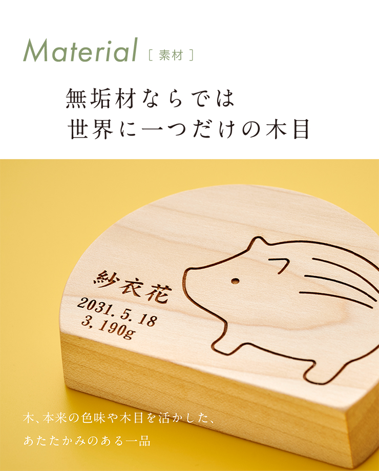 | 木製名前札 干支線画タイプ ■ひとつひとつ職人さんの手づくり。まあるい半月デザインが可愛い名前札 ■選べる12干支 ■無垢材ならでは世界に一つだけの木目 ■レーザー刻印だから消える心配もありません 《注意事項》 ・天然無垢素材の質感を生かした商材です。木目や色、節の有無など、一つひとつ違いがあります。また、湿気や乾燥などで膨張や収縮、反りなどの変化が発生する場合があります。天然素材の特徴をご理解いただいた上でご購入ください。 ・一つ一つ手作りのため、表記サイズと完成形のサイズに多少の誤差が生じる場合がございます。予めご了承ください。 ・カビ、または木の変形、変色が早まる恐れがあるため、使用時、保管時ともに、高温多湿、直射日光を避けてご愛用ください。 ・本商品は食べ物ではありません。口の中には絶対に入れないでください。 ・小さなお子様が手を触れない場所にお飾りください。 ・平らな安定した場所にお飾りください。 ・ギフトラッピング&熨斗には対応していませんのでご了承ください。 | |