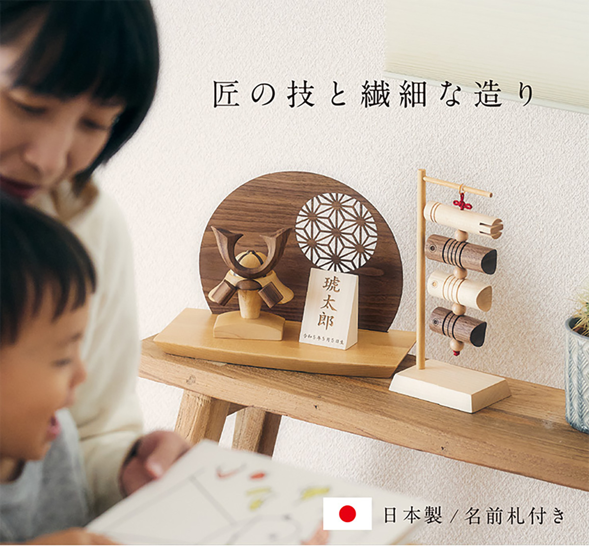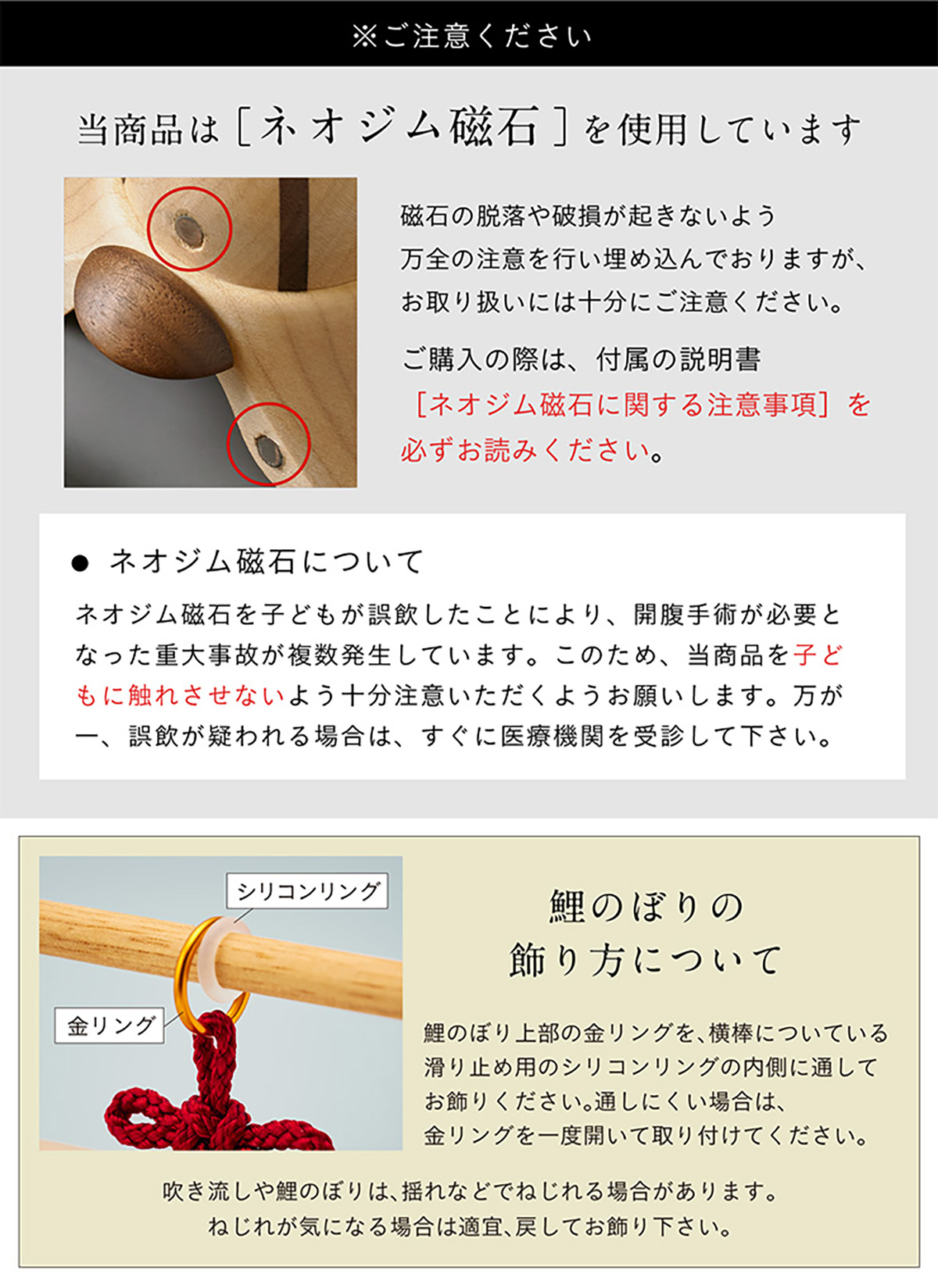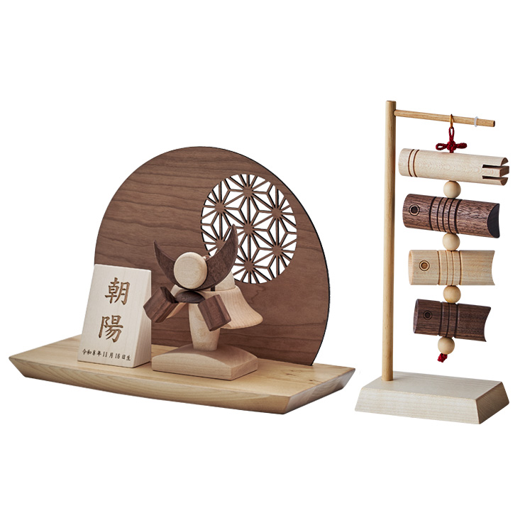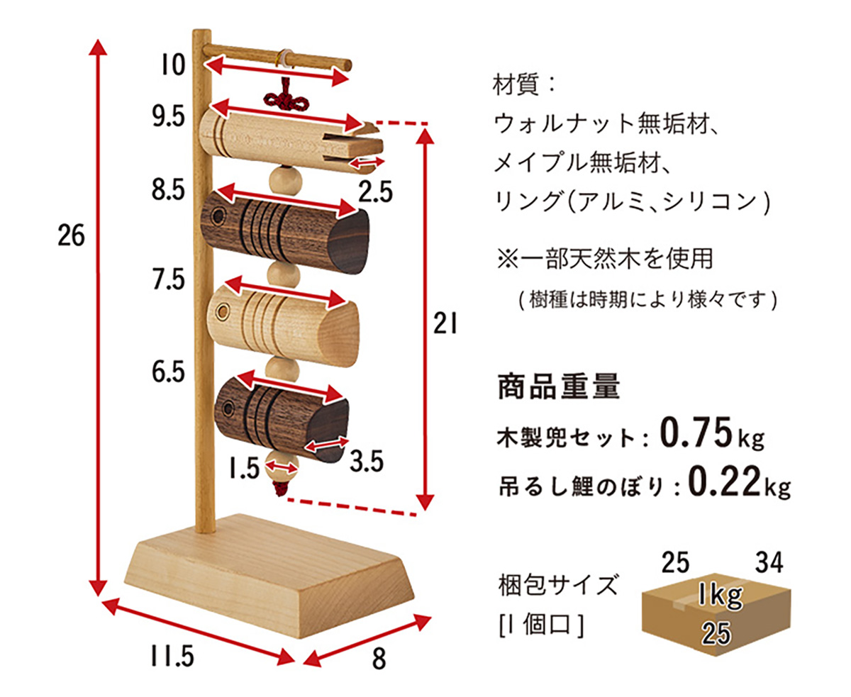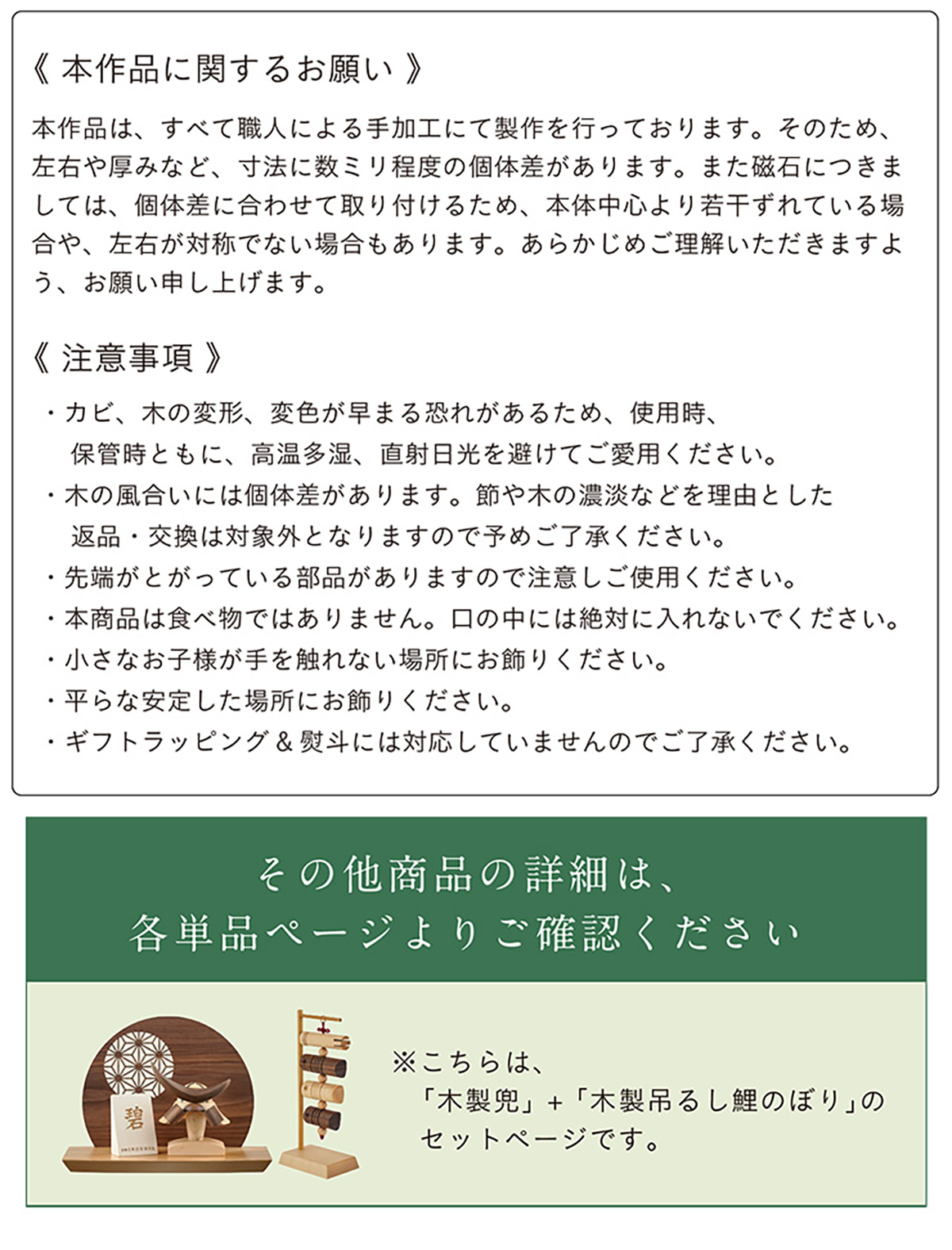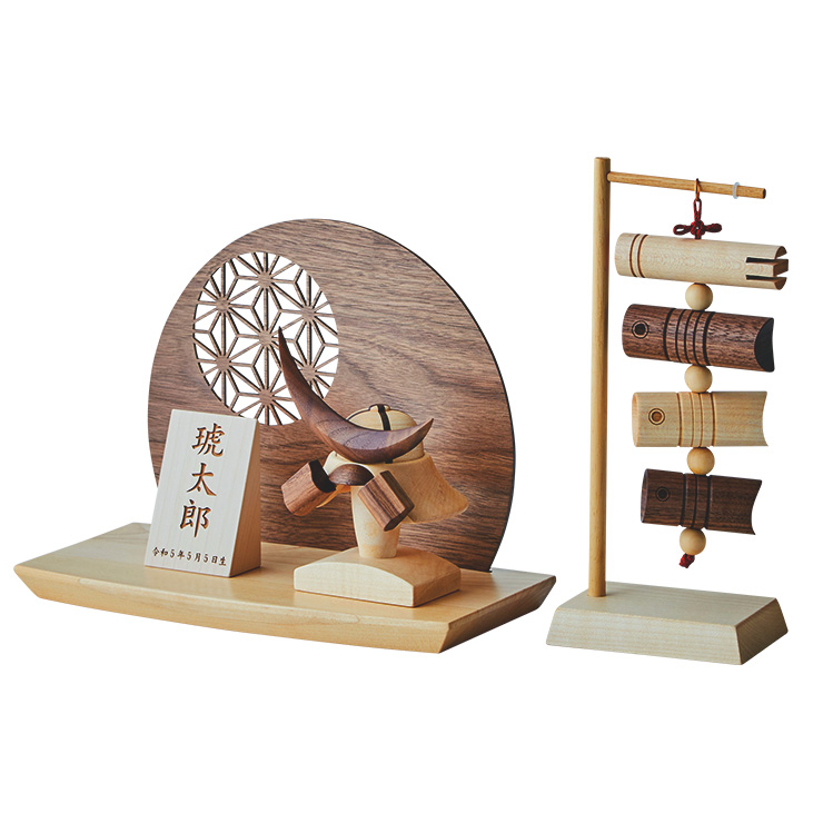 | 素材 | 兜:メイプル無垢材、ウォールナット無垢材、バーチ無垢集成材(ウレタン仕上げ)、ウォルナット突板 鯉のぼり:ウォルナット無垢材、メイプル無垢材、リング(アルミ、シリコン) |