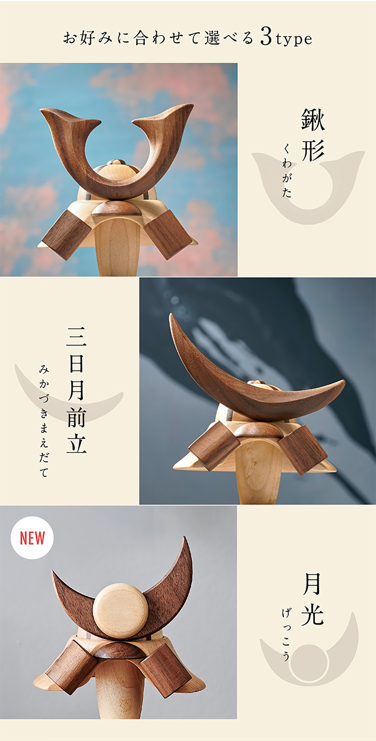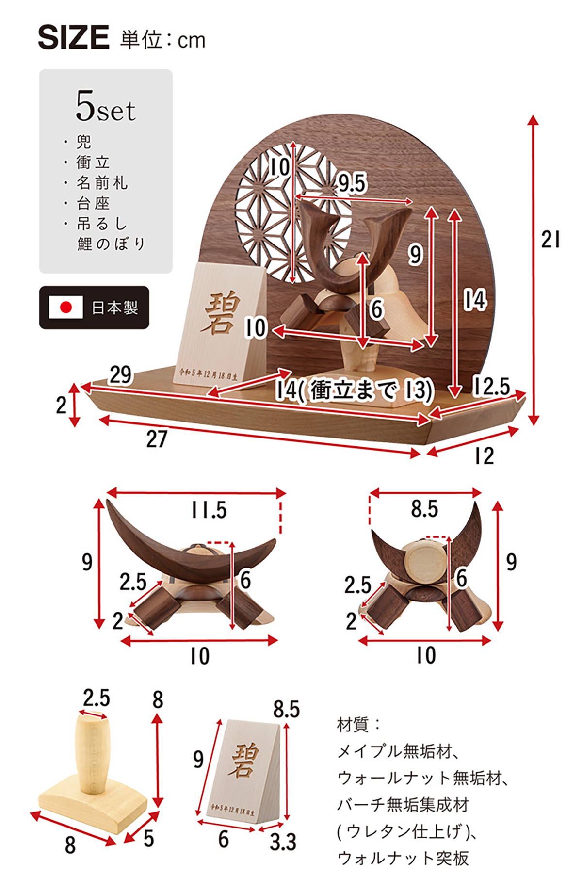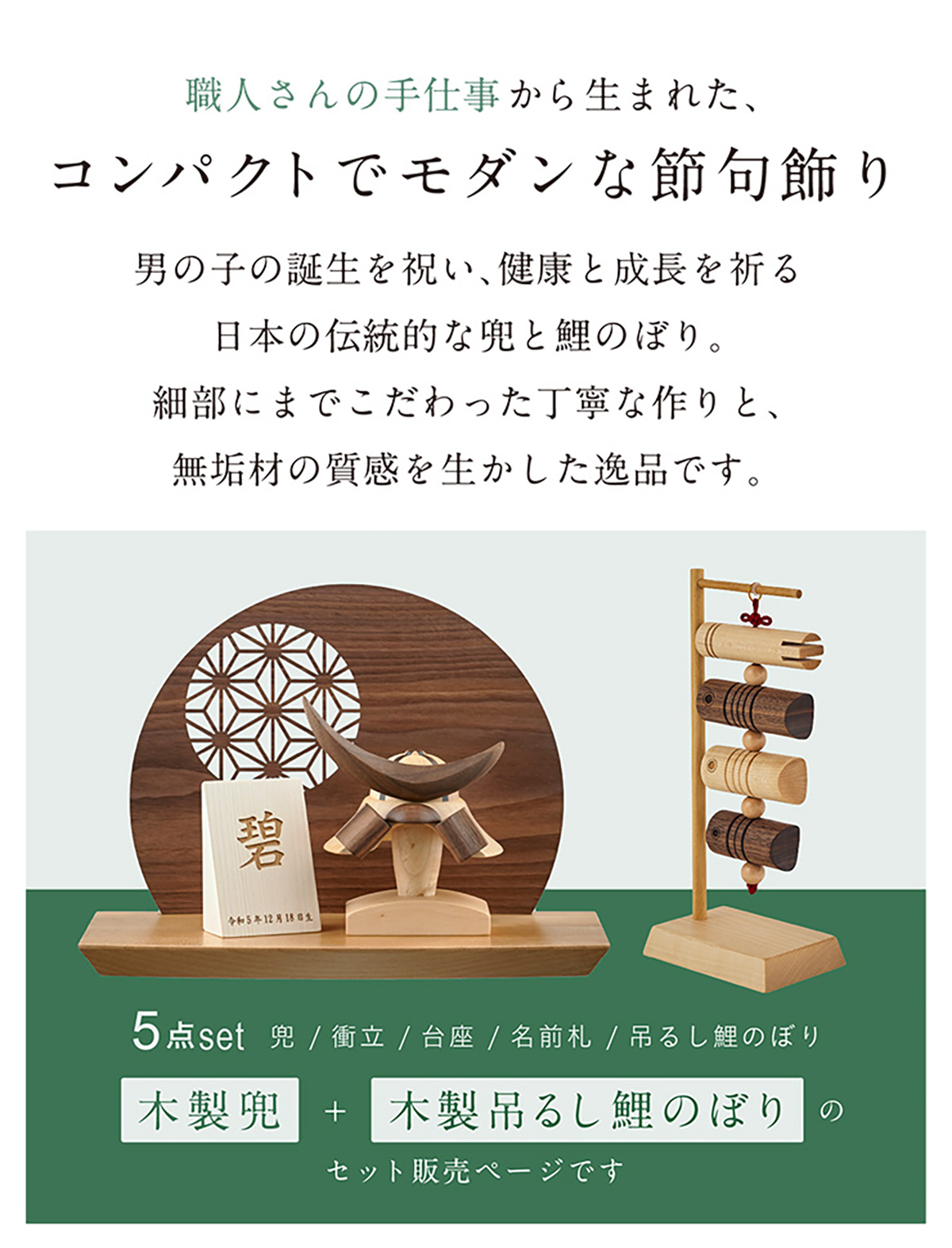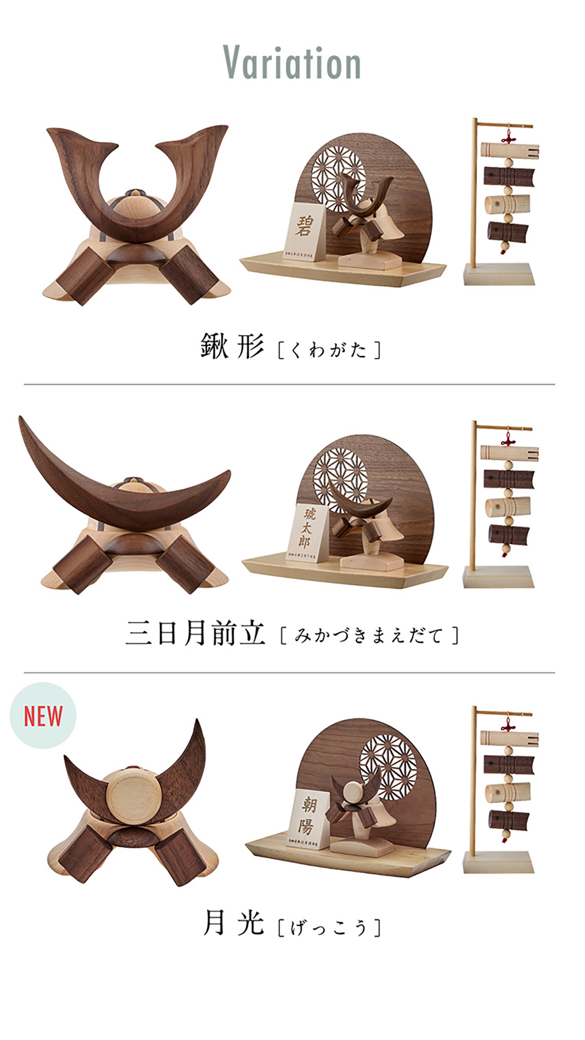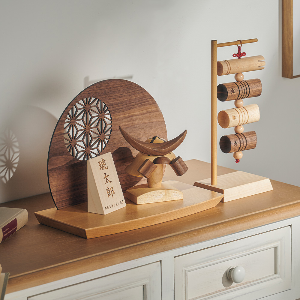 | 素材 | 兜:メイプル無垢材、ウォールナット無垢材、バーチ無垢集成材(ウレタン仕上げ)、ウォルナット突板 鯉のぼり:ウォルナット無垢材、メイプル無垢材、リング(アルミ、シリコン) |