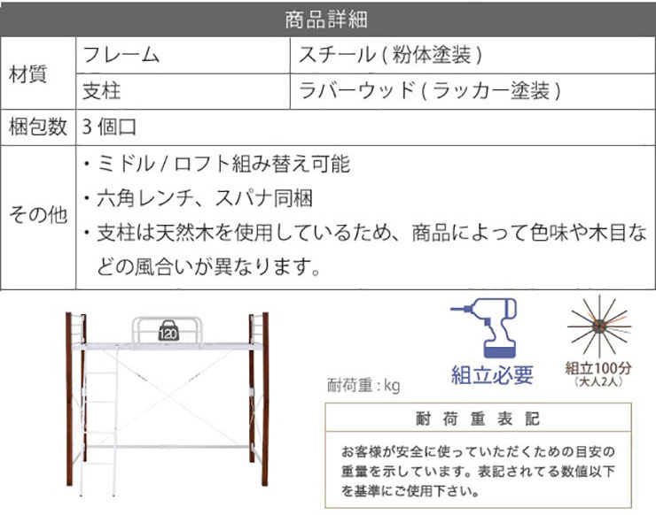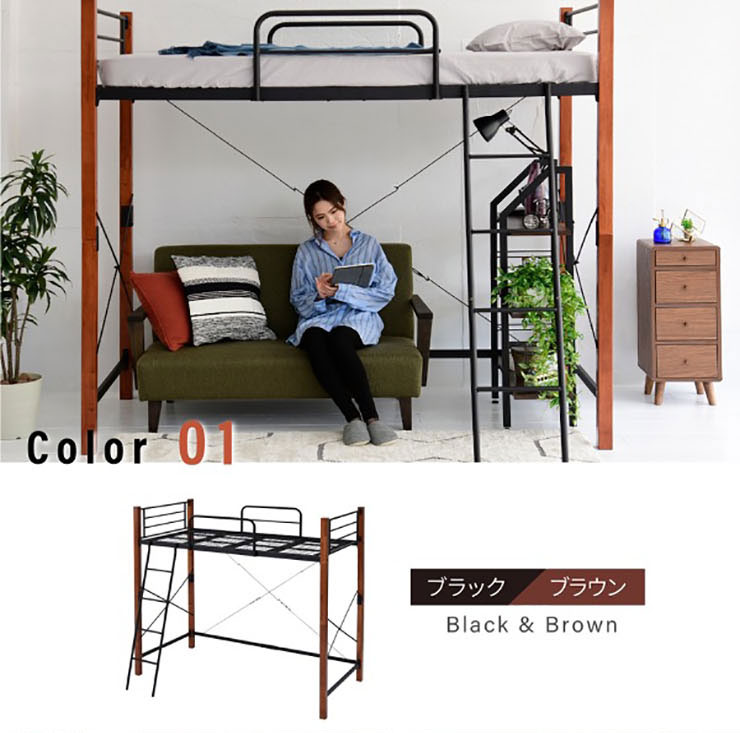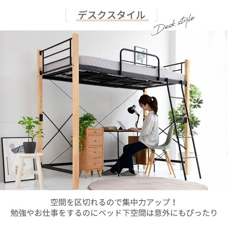 | 天然木脚パイプベッド ロフトタイプ 温かみのある天然木とクールなスチールのコントラストがおしゃれな、お部屋のスペースを有効活用できるロフトベッド。ベッド下のスペースにはデスクを置いたりソファを置いたり、生活空間の一部としても十分使える高さが確保されています。お部屋の雰囲気にあわせて選べる4カラー展開が嬉しい! ■高級感のある天然木 脚には木の素材をそのままに感じられる天然木を採用。シンプルなデザインながらも高級感を味わえるベッドです。 ■空間を上手に使える機能性 ロフトベッド最大の魅力、それはベッド下のフリースペース。イスに座っても余裕があるほど高さがたっぷり確保されているので、区切られたひとつの小部屋みたいな感覚で使うことができます。 ■ぐっすり眠れる安心感 安心してぐっすり眠っていただけるようサイドガードを設置。寝返りを打ってうっかり落ちてしまうことのない安全設計。マットレスのずり落ちも防ぐので、快適な睡眠をサポートします。 ■通気性抜群で湿気対策 床面は適度な通気性をもったメッシュ床。通気性を良くすることで、湿気からベッドを守ります。 ※こちらの商品はお客様組み立てとなります。 ※こちらはベッドフレームのみの販売となります。寝具等は付属しておりません。 ※天然木を使用しているため、商品によって色味や木目などの風合いが異なります。 | |